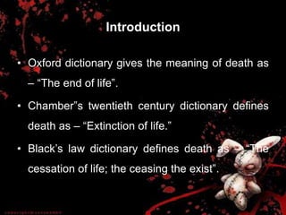The document discusses various topics related to modes of death from a forensic nursing perspective. It defines death as the permanent and irreversible cessation of the nervous, circulatory and respiratory systems. It describes three types of death: 1) somatic/systemic/clinical death which is the complete stoppage of vital functions, 2) cellular/molecular death which is death of individual tissues and cells, and 3) brain death which is the permanent cessation of brain function. It provides clinical criteria for determining cessation of the heart, breathing, and brain. It also discusses suspended animation, unexpected sudden death, and causes and medico-legal importance of different modes of death.