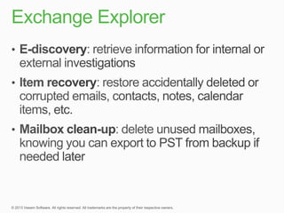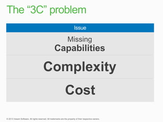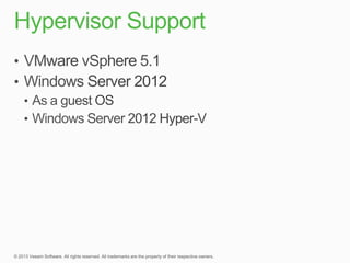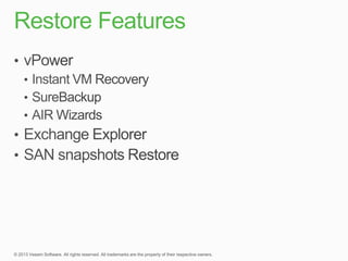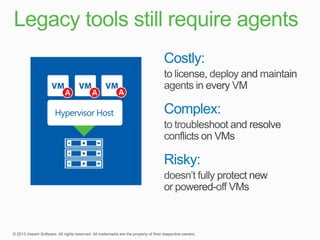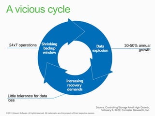 This document summarizes a new product called vPower that provides faster and more efficient backups compared to traditional solutions. vPower uses direct-SAN-access with Changed Block Tracking to backup virtual machines, compressing and deduplicating backups within 3 minutes. It also enables features like storage migration and verification of backups. The document contrasts vPower's simpler, more automated approach to backing up virtual environments versus the expensive agents and multiple complex steps required by traditional backup solutions.
