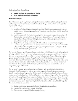A warm up improves athlete performance by increasing core temperature, muscle elasticity, nerve conduction speed, and blood flow to working muscles. A cool down aids recovery by gradually lowering heart rate and flushing lactic acid from muscles through light exercise and static stretching. Both warm ups and cool downs are important for reducing injury risk and allowing athletes to train or compete at their best.