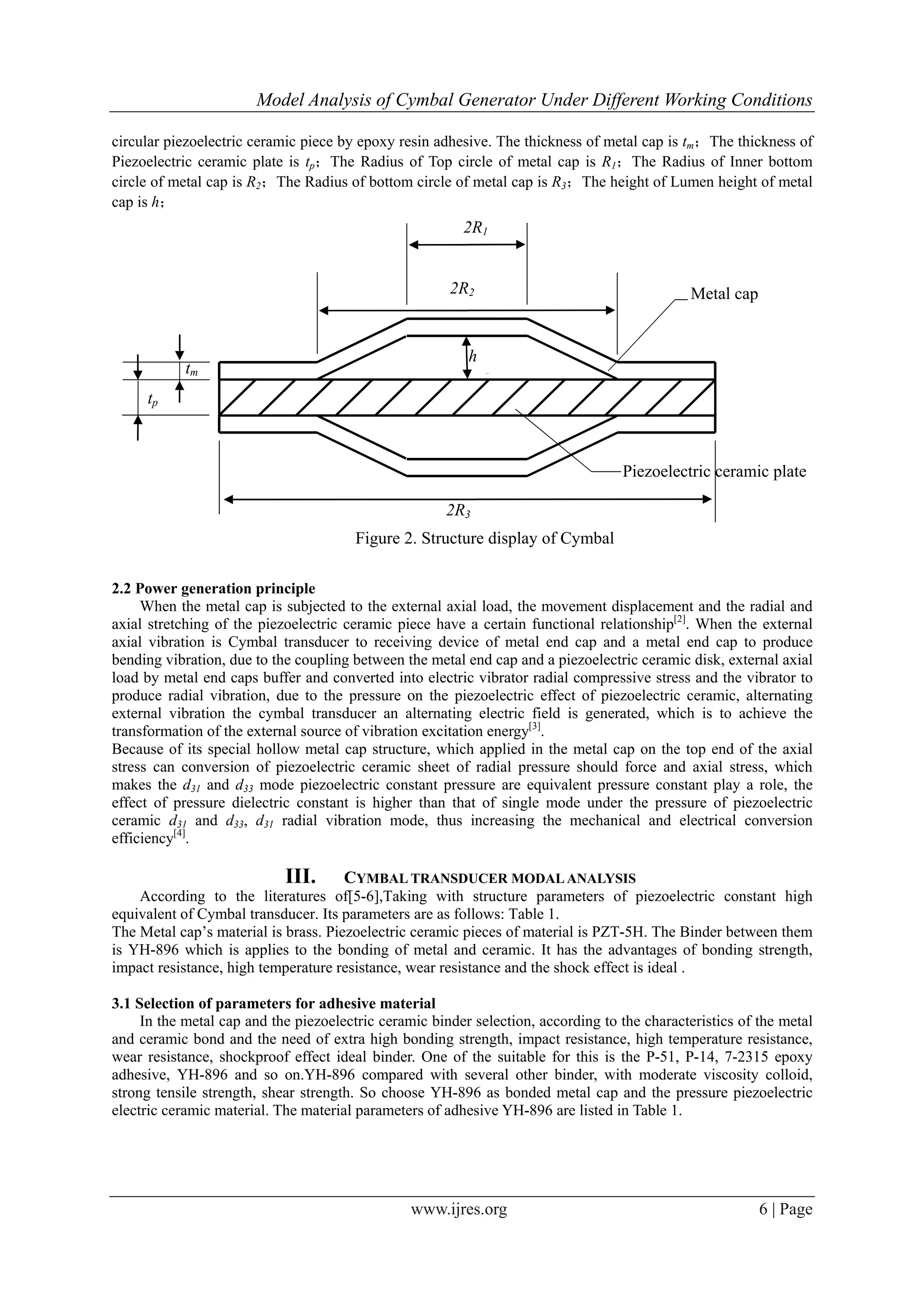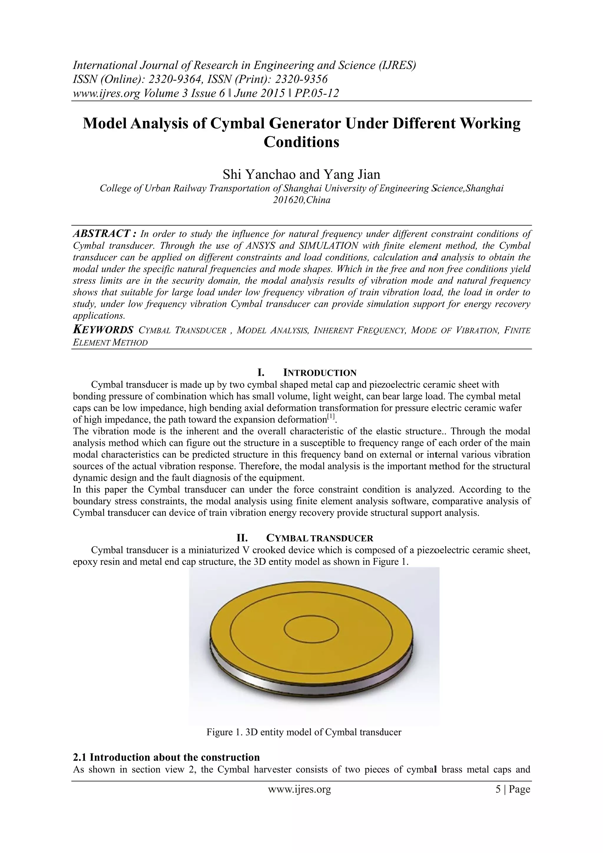 The modal analysis of a cymbal transducer is conducted to determine its natural frequencies and vibration modes under different working conditions. The cymbal transducer consists of a brass metal cap and a PZT-5H piezoelectric ceramic sheet bonded together. Finite element analysis is performed using ANSYS to obtain the first six natural frequencies and mode shapes of the cymbal transducer in free state. The results from ANSYS are validated by comparing with those from simulation, and they match well.