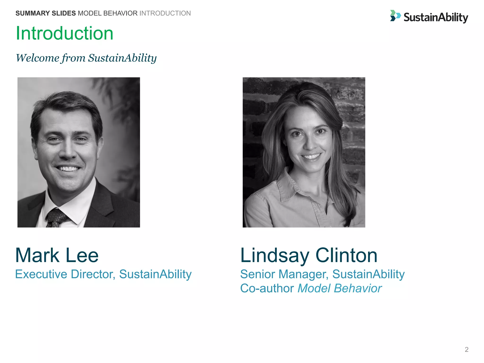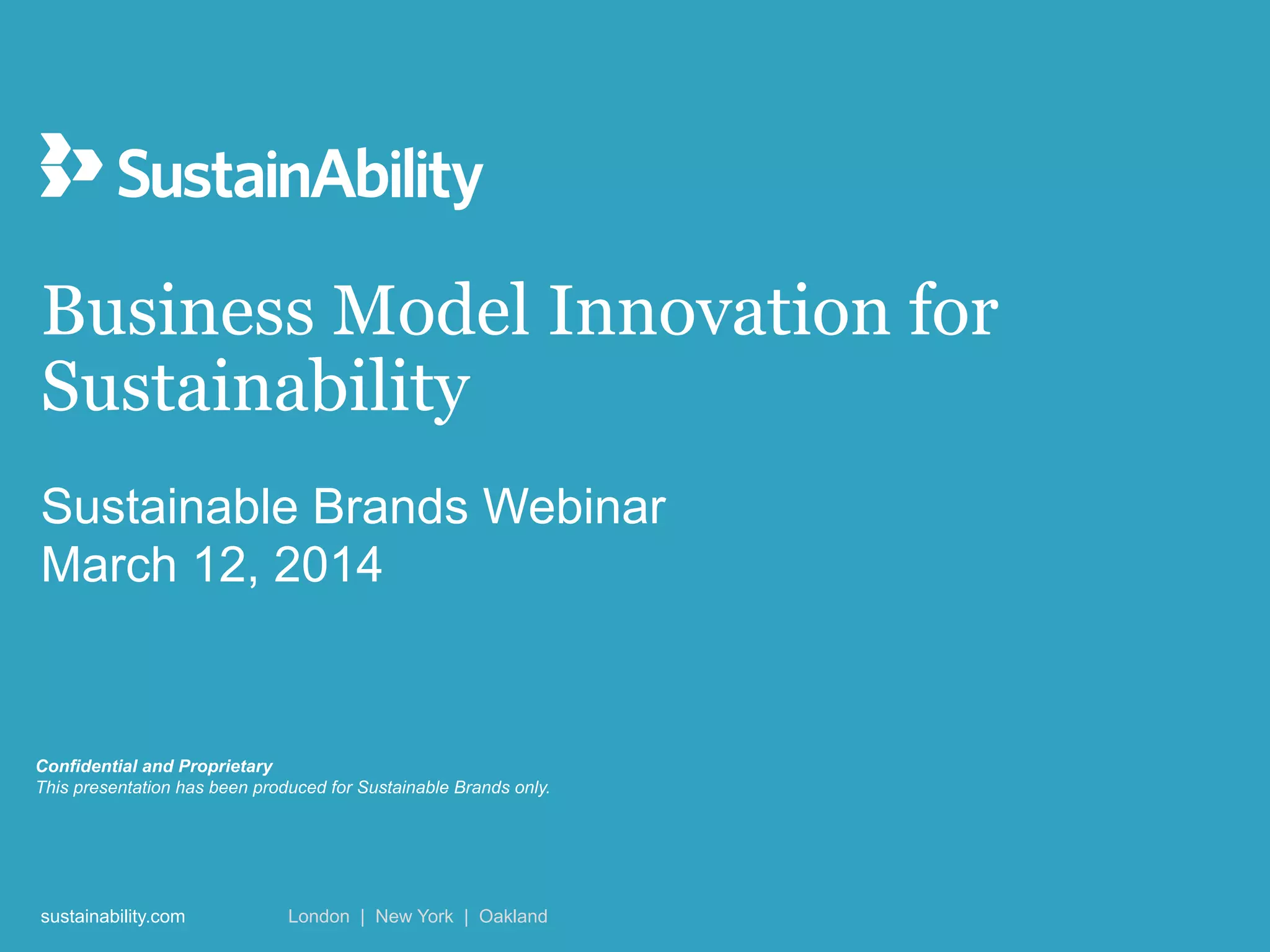 The document presents findings on business model innovation for sustainability through the 'Model Behavior' report, which reviewed over 100 companies and 80 examples of innovative models. It identifies 20 distinct business models in areas such as environmental impact, social innovation, diverse impact, and financing innovation, highlighting how companies can create sustainable outcomes by understanding stakeholder needs. Key takeaways emphasize that innovation opportunities exist within the value chain and larger companies can facilitate the maturation of new models through partnerships and acquisitions.