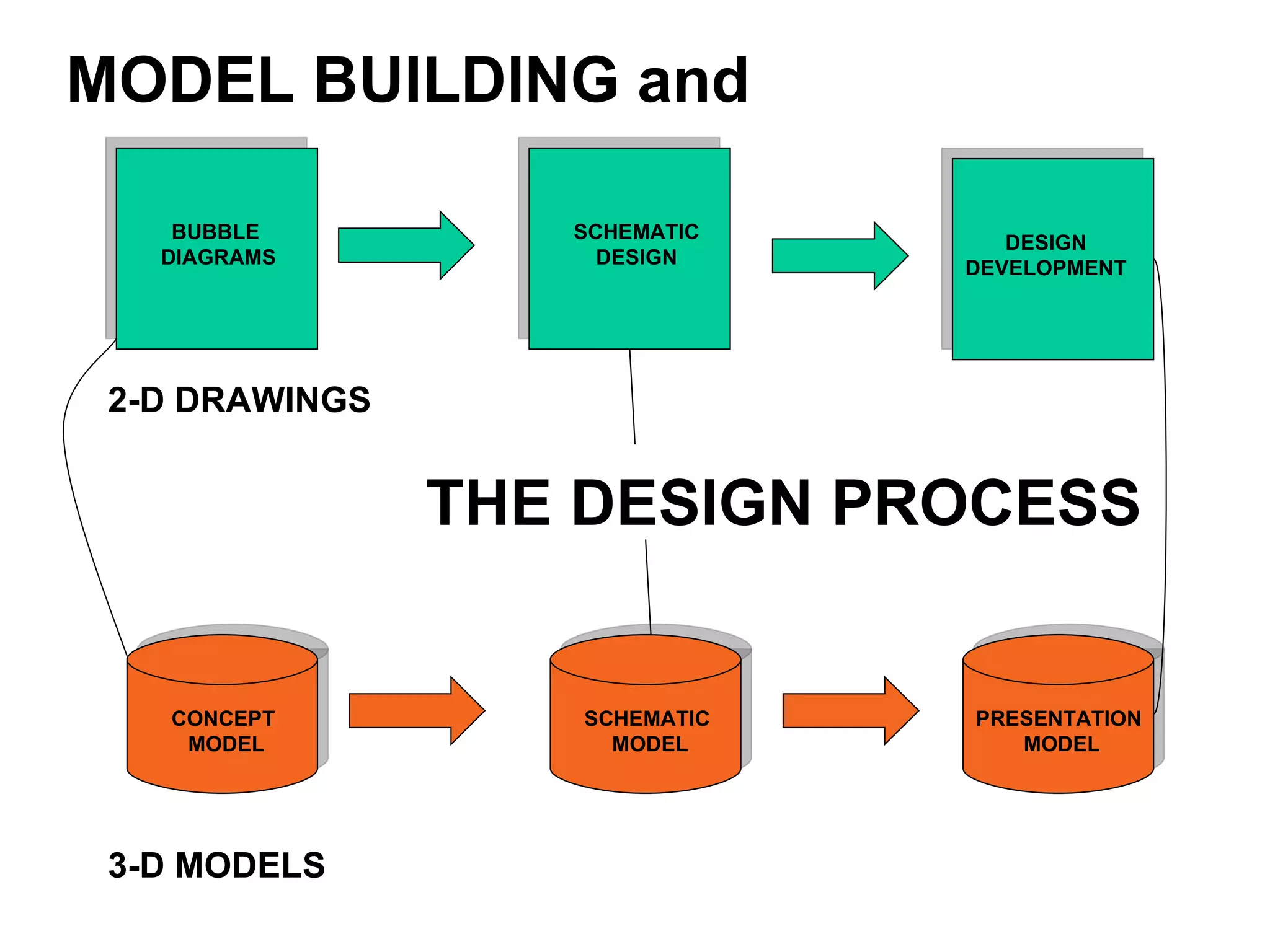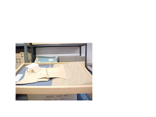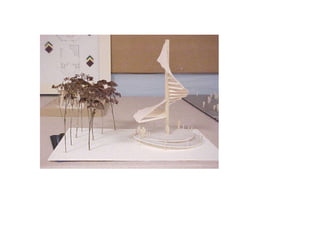 The document discusses the model building process used in schematic design and design development. It describes different types of models like concept models, site contour models, and presentation models. It provides guidance on materials to use, such as matte board, foamcore board, and corrugated cardboard. It recommends X-Acto knives for cutting and provides tips for representing vegetation, grass, and roads in an abstract way in models.