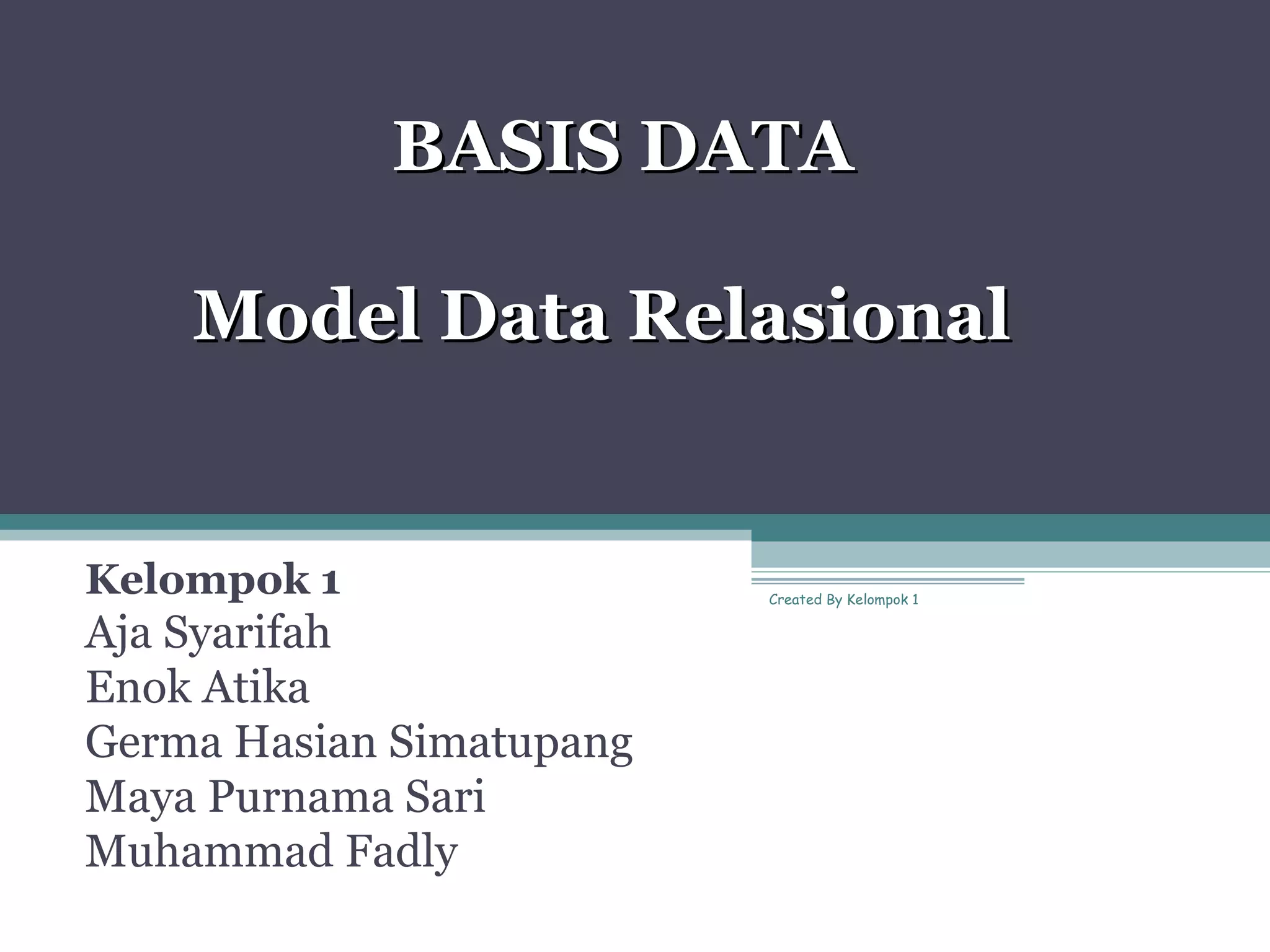 Model data relasional adalah cara pengorganisasian basis data menggunakan tabel dua dimensi, dengan kolom dan baris, yang memudahkan operasi dan akses data. Keuntungan utamanya termasuk kemudahan perubahan struktur, akurasi data, dan kemampuan untuk membuat query kompleks. Kunci dalam model ini meliputi primary key, candidate key, dan foreign key, dengan peraturan integritas yang penting untuk menjaga kevalidan data.