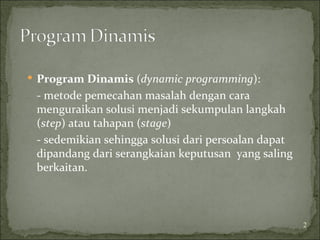 Dokumen ini membahas tentang metode pemecahan masalah program dinamis, menjelaskan prinsip optimalitas dan bagaimana keputusan optimal diambil pada setiap tahap. Metode ini melibatkan proses pengambilan keputusan berdasarkan solusi tahap sebelumnya dan membedakan antara pendekatan maju dan mundur untuk menyelesaikan masalah. Contoh aplikasi nyata dari program dinamis juga diberikan, termasuk permasalahan alokasi dana untuk proyek dan knapsack problem.