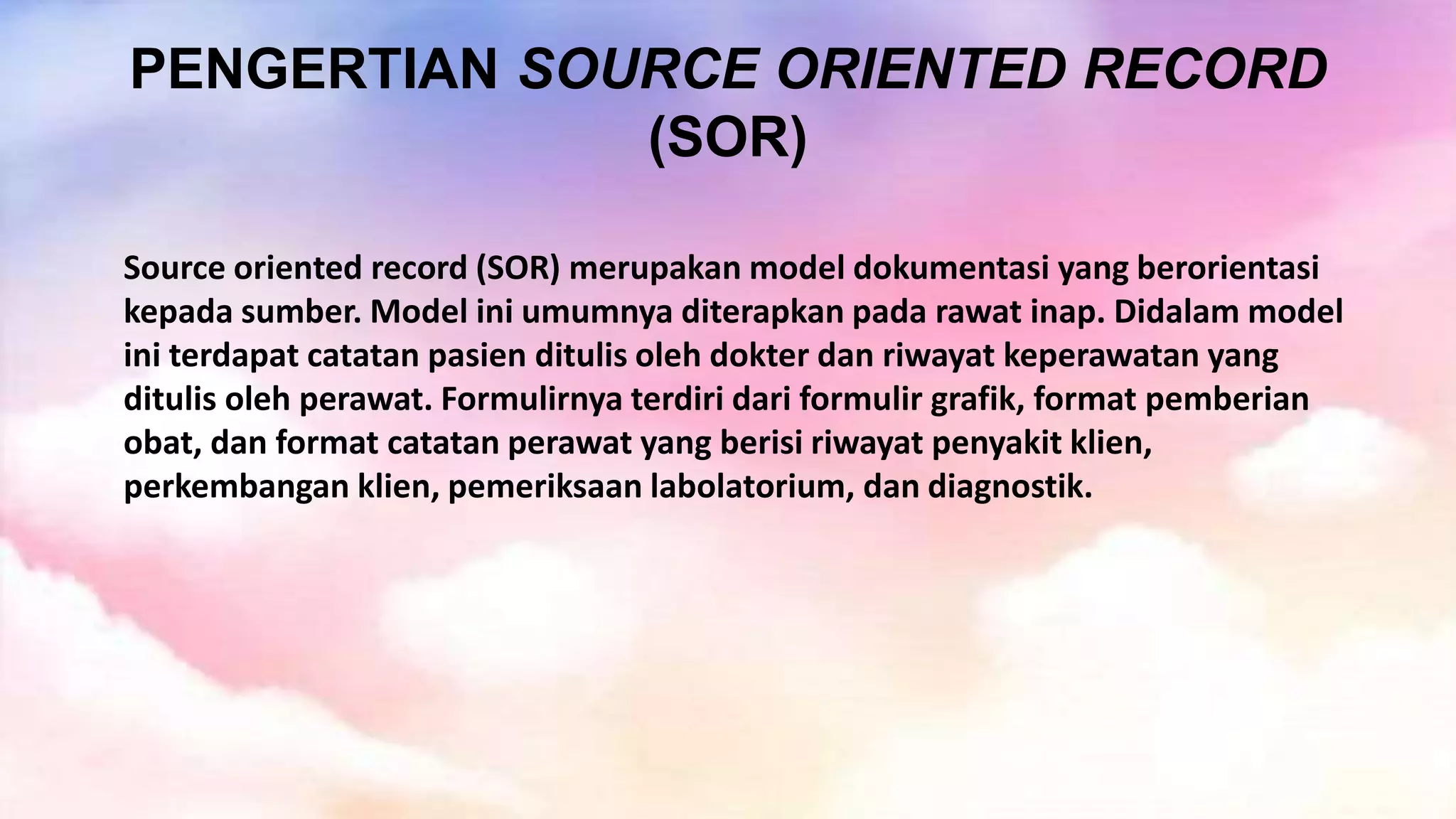 Source Oriented Record (SOR) adalah model dokumentasi kesehatan yang berorientasi pada sumber informasi, di mana setiap anggota tim medis membuat catatan sendiri berdasarkan observasi mereka. Model ini memisahkan dokumentasi antara dokter, perawat, bidan dan spesialis lainnya. Keuntungan SOR adalah data disajikan secara berurutan dan mudah diidentifikasi, sedangkan kerugianya adalah sulit mencari data sebelumnya dan memerlukan w