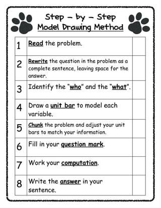 This document outlines an 8-step model drawing method for solving problems. The steps are: 1) read the problem, 2) rewrite the question as a sentence, 3) identify who and what are involved, 4) draw unit bars to model the variables, 5) chunk the problem and adjust the unit bars, 6) fill in the question mark, 7) work through the computation, and 8) write the answer in the sentence.