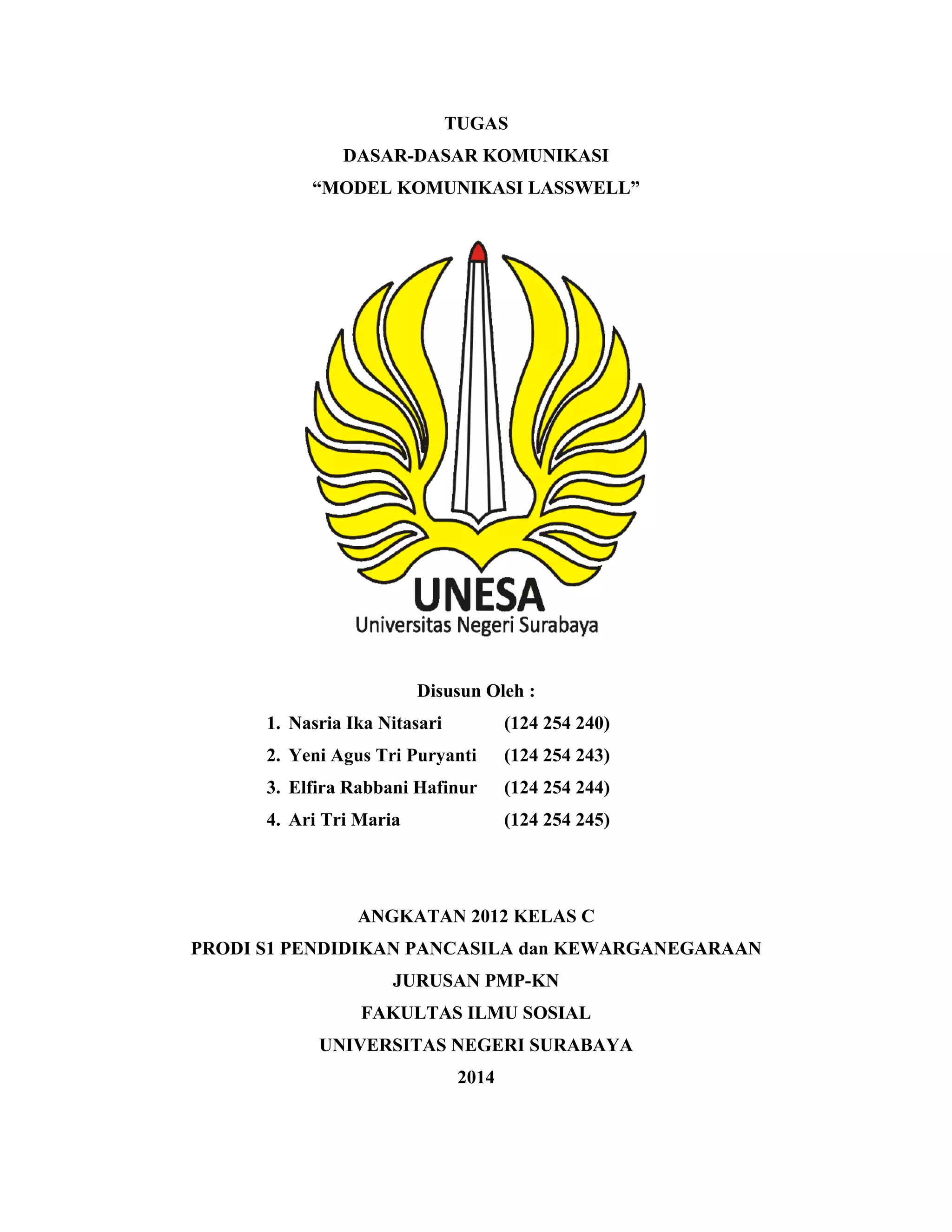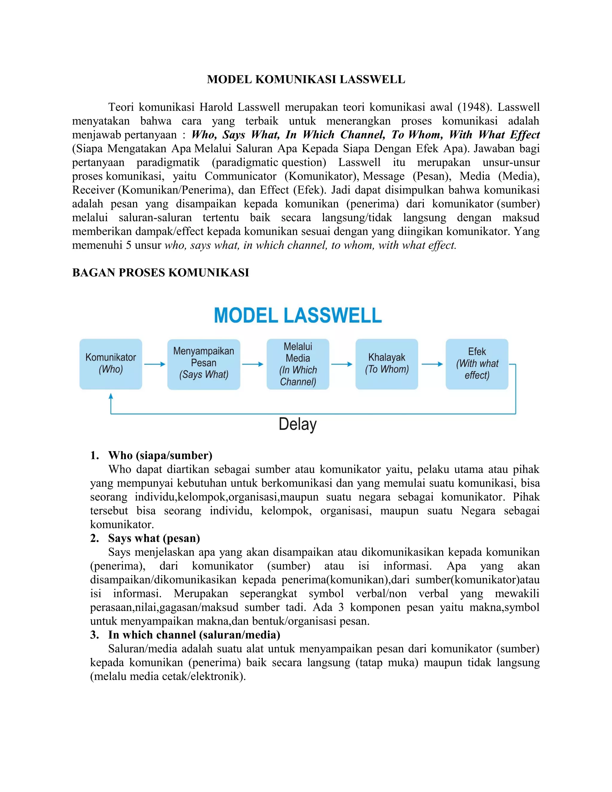 Model komunikasi Lasswell menjelaskan proses komunikasi melalui 5 unsur: siapa yang mengatakan apa melalui saluran apa kepada siapa dengan efek apa. Teori ini mengidentifikasi komunikator, pesan, saluran, penerima, dan efek sebagai komponen utama dalam proses komunikasi. Model ini memberikan panduan dasar untuk memahami dinamika komunikasi meskipun memiliki keterbatasan dalam menjelaskan sifat timbal balik komunikasi.