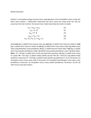 Dokumen ini menjelaskan model matematika untuk jaringan penukar panas dalam sistem energi boiler steam, mencakup persamaan kestimbangan masa dan energi. Diberikan juga asumsi dan kendala yang digunakan dalam model, serta proses linierisasi untuk menghitung variabel-variabel tertentu. Selain itu, perangkat lunak Sistem digunakan untuk membantu perhitungan dan iterasi nilai variabel.