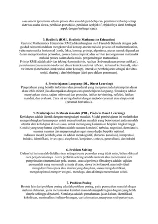 Dokumen ini menjelaskan berbagai model pembelajaran yang dapat digunakan untuk memenuhi cara-gaya belajar siswa, termasuk pembelajaran koperatif, kontekstual, dan berbasis masalah, serta pentingnya menyesuaikan model dengan kondisi siswa dan materi. Setiap model memiliki sintaks dan prinsip yang berbeda, tetapi semua bertujuan untuk meningkatkan keterlibatan siswa dan memfasilitasi pemahaman yang lebih baik. Penekanan diberikan pada kreativitas guru dalam mengadaptasi dan mengimplementasikan pendekatan yang sesuai di dalam kelas.