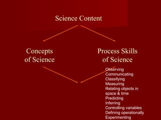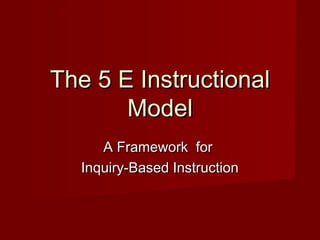 This document outlines the 5 E instructional model, a framework for inquiry-based science instruction. It describes the 5 phases - Engage, Explore, Explain, Elaborate, Evaluate - and provides examples of activities for each phase, such as demonstrations, investigations, and assessments. It also lists science process skills like observing, measuring, and predicting. The document aims to provide guidance for designing lessons according to the 5 E model in order to engage students in active science learning.