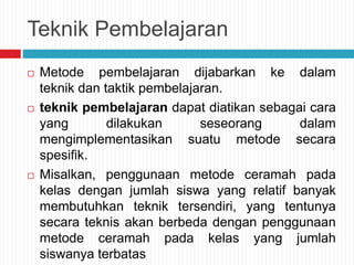 Dokumen ini membahas teknik dan model pembelajaran, menjelaskan perbedaan antara metode, teknik, dan model pembelajaran yang merupakan kesatuan dalam proses pengajaran. Model pembelajaran memiliki perencanaan yang berdasar pada pendekatan dan tujuan yang jelas, dengan dua model utama yaitu cooperative learning dan problem based learning. Setiap model memiliki karakteristik dan langkah-langkah spesifik untuk meningkatkan efektivitas proses belajar mengajar.