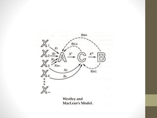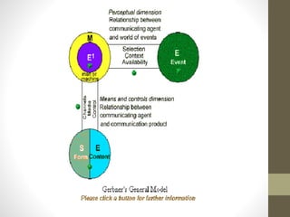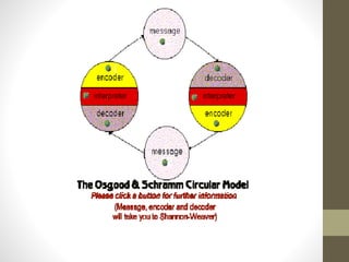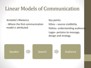 This document summarizes several models of communication, including linear models attributed to Aristotle and Lasswell, as well as interactive models like Osgood and Schramm's circular model. It also discusses transactional models such as Dance's helical model and Rogers and Kincaid's convergence model. For each model, it provides 1-2 key points about the components and perspectives they represent in the communication process.