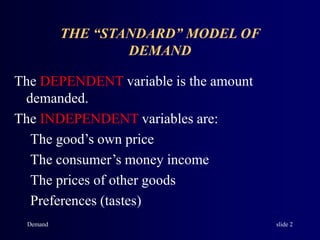 The document discusses the standard model of demand. Demand is defined as the quantity of a good that consumers are willing and able to purchase at various prices over a given period of time. A demand curve graphs the relationship between the price of a good and the quantity demanded while holding all other factors that influence demand constant. The demand curve will slope downward, as higher prices are associated with lower quantities demanded according to the law of demand. Shifts in factors like income, prices of related goods, and preferences can shift the demand curve and thereby change the quantity demanded at each price level.