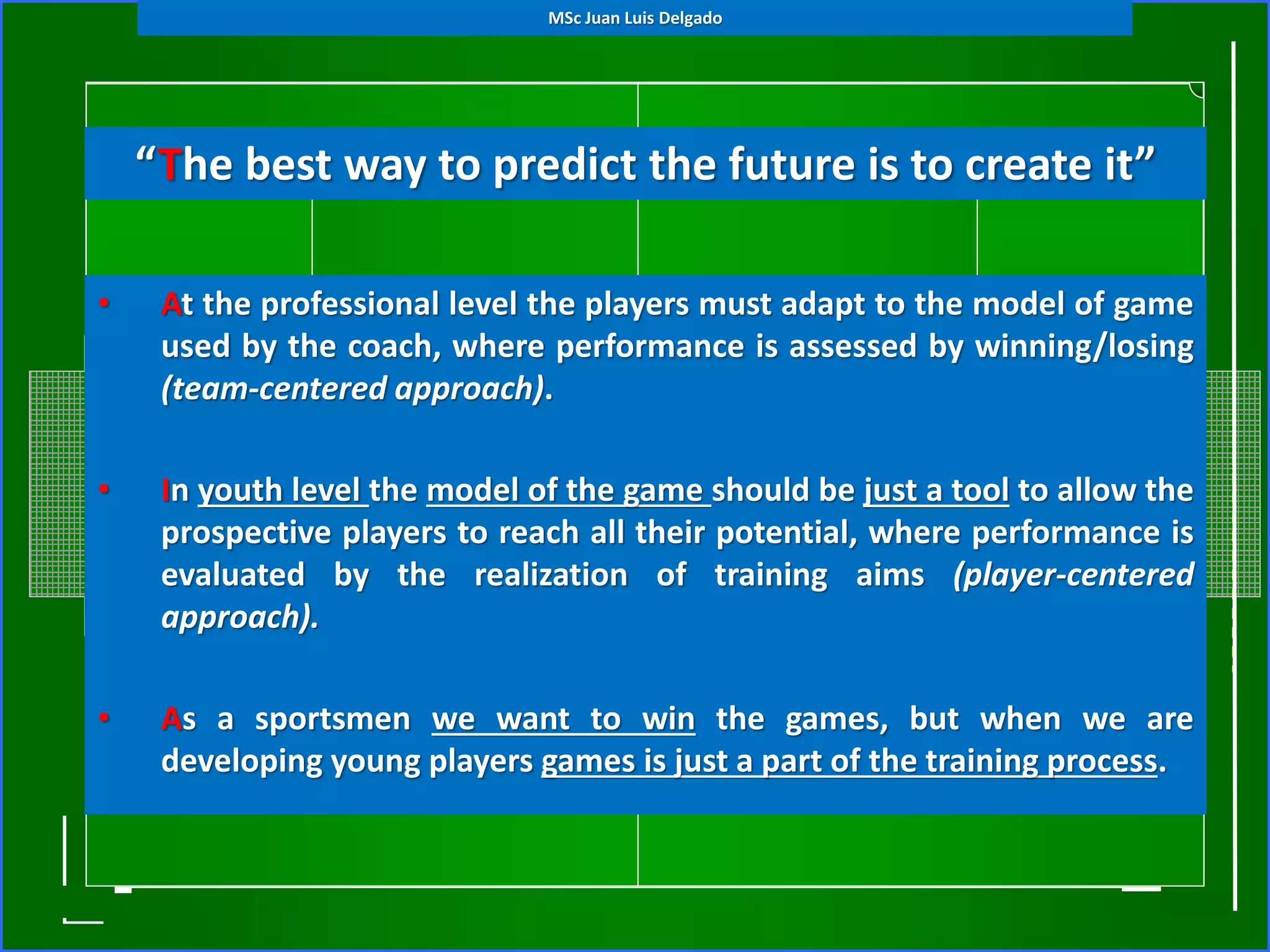 The document discusses models of game used at different levels of soccer. At the professional level, the model of game is team-centered and aims to win games. At the youth level, the model should be player-centered and used as a tool to develop players' potential, not just win games. An effective model of game incorporates tactical principles for different moments and phases, playing systems tailored to player development, and emphasis on individual tactical functions over early specialization. The training model should integrate tactical, technical, and physical periodization to optimize player development.