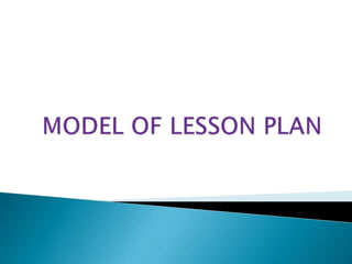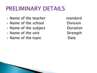 The document outlines the structure and components of a lesson plan, including identifying information about the teacher, school, subject, unit, and date. It describes sections for curricular statements, content overview, and learning outcomes. Additionally, it lists elements that make up the lesson such as terms, facts, concepts, prerequisites, teaching strategies, and resources. The lesson plan structure also includes an introduction, development of content, classroom interaction, response, consolidation, post-lesson activities, review questions, and assignment.