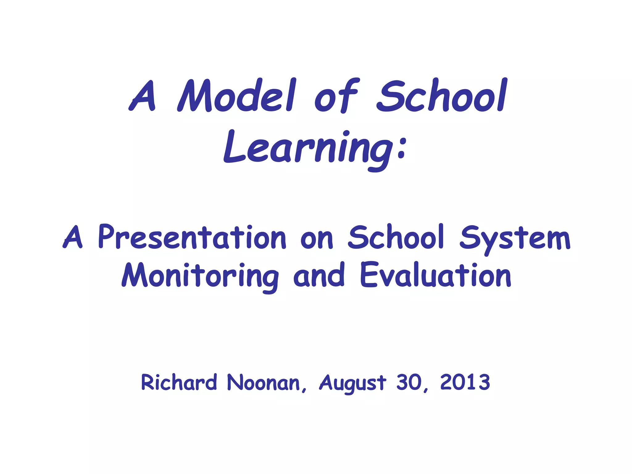 The document presents a model for monitoring and evaluating school systems, emphasizing the roles of inputs like students and teachers, and processes that lead to learning outcomes and labor market results. It highlights the importance of feedback loops to assess efficiency and cautions against confusing correlation with causation in educational contexts. The model aims to aid in planning, management, and development while acknowledging the complex frameworks surrounding education systems.