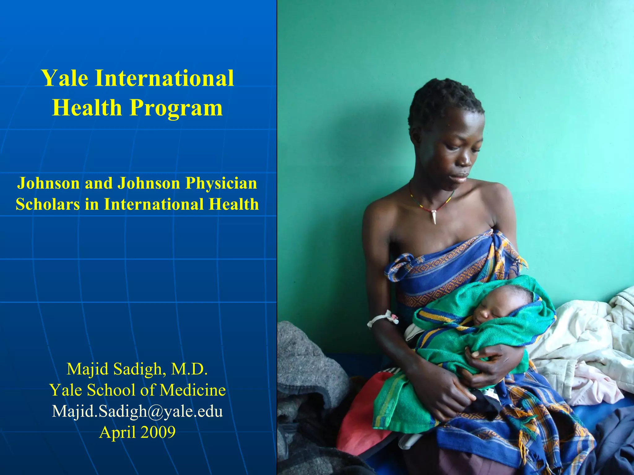 The document outlines the goals and activities of the Yale International Health Program which aims to reduce health disparities globally. It details plans to organize clinical rotations in countries like Eritrea, Uganda, Liberia, Indonesia and Honduras. The program partners with institutions like Makerere University in Uganda to improve patient care through enhanced medical education and research. Some accomplishments include developing an online resource page for a computer lab and capacity building activities. Lessons learned include the importance of preparation, clear goals and flexibility between partner institutions.