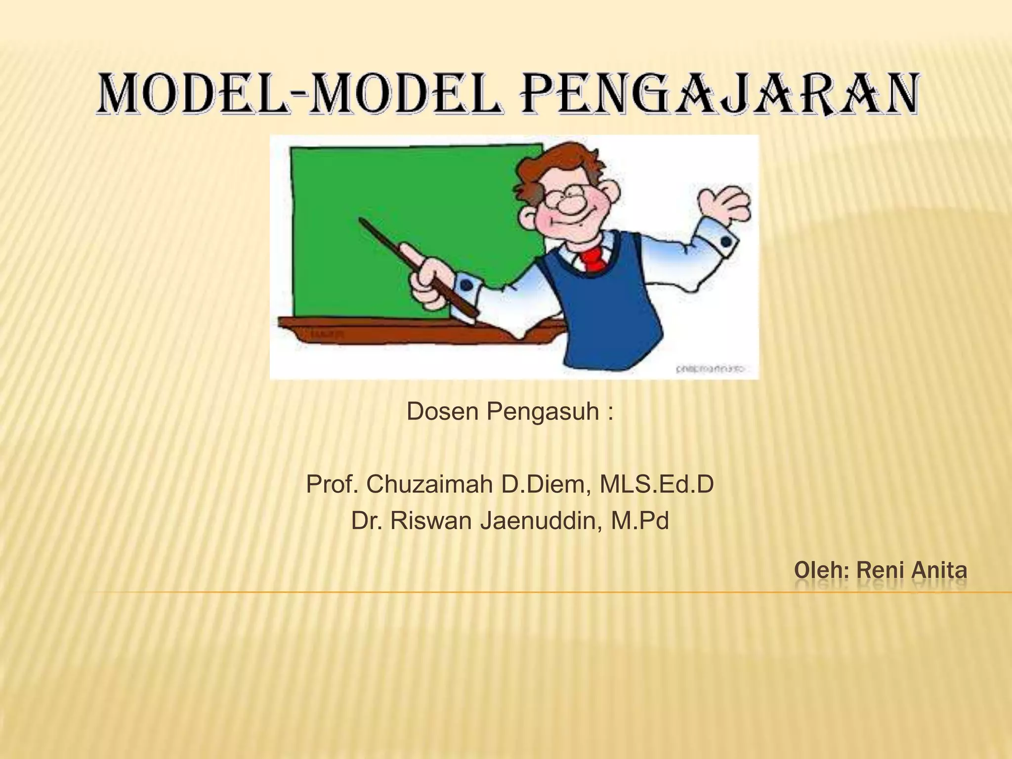 Dokumen tersebut membahas beberapa model pengajaran yang dikelompokkan menjadi empat kelompok, yaitu kelompok model pengolahan informasi, kelompok model pengajaran sosial, kelompok model pengajaran personal, dan kelompok sistem perilaku. Setiap kelompok terdiri atas beberapa model pengajaran dengan penjelasan strategi dan tahapan pelaksanaannya.