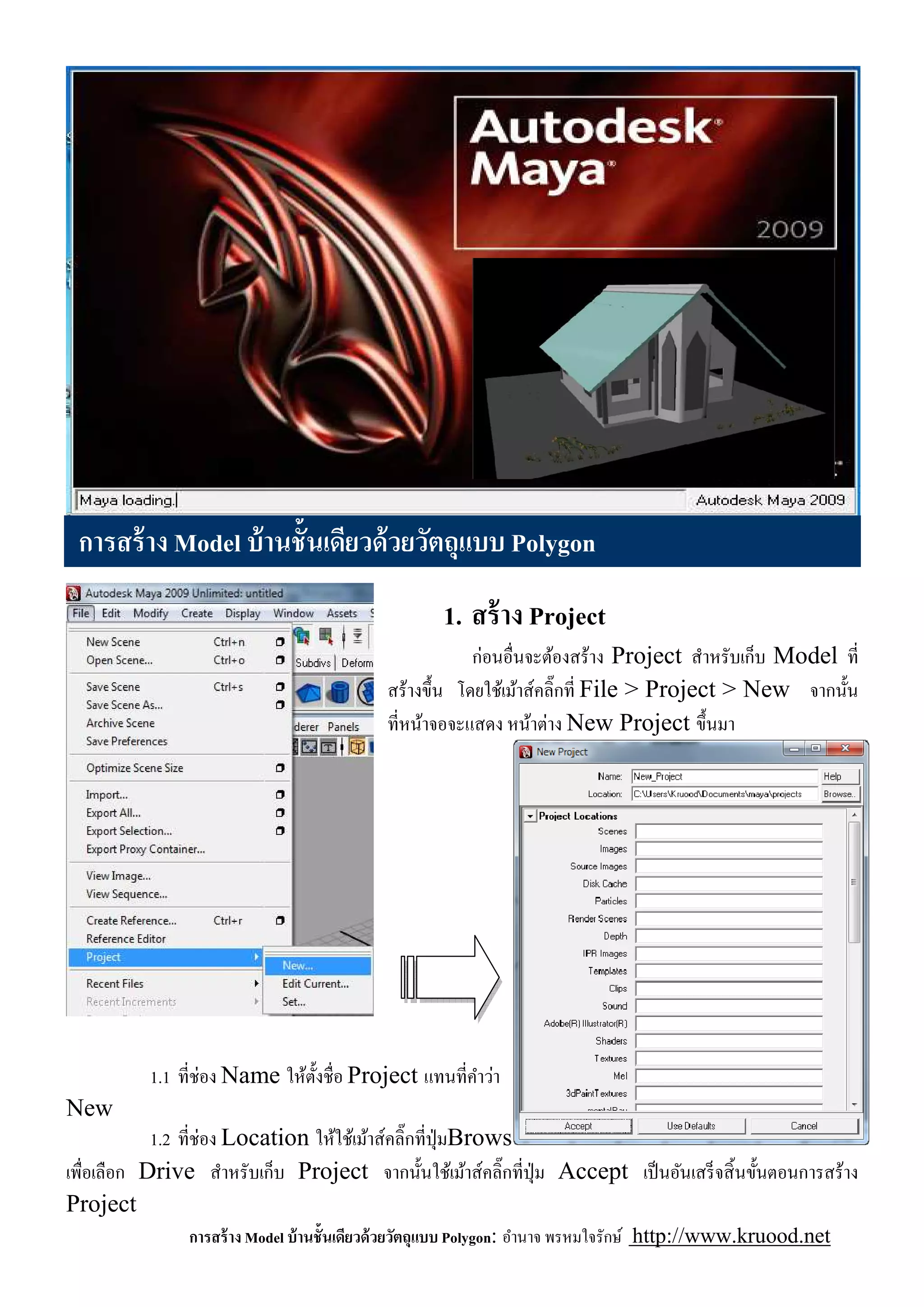 บ้ านชันเดียวด้ วยวัตถุแบบ Polygon 1. สร้ าง Project ก่อนอืนจะต้องสร้าง Project สําหรับเก็บ Model ที สร้างขึน โดยใช้เม้าส์คลิ'กที File > Project > New จากนัน ทีหน้าจอจะแสดง หน้าต่าง New Project ขึนมา 1.1 ทีช่อง Name ให้ตงชือ Project แทนทีคําว่า ั New 1.2 ทีช่อง Location ให้ใช้เม้าส์คลิ'กทีปุ่ มBrows เพือเลือก Drive สําหรับเก็บ Project จากนันใช้เม้าส์คลิ'กทีปุ่ ม Accept เป็ นอันเสร็ จสิ นขันตอนการสร้าง Project การสร้ าง Model บ้ านชันเดียวด้ วยวัตถุแบบ Polygon: อํานาจ พรหมใจรักษ์ http://www.kruood.net