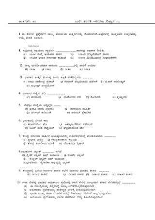 vÀgÀUÀw –¸ÀªÀiÁd «eÁÕ£À 17 I F PɼÀV£À ¥Àæ±ÉßUÀ½UÉ £Á®ÄÌ ¥ÀAiÀiÁðAiÀÄ GvÀÛgÀUÀ¼À£ÀÄß PÉÆqÀ¯ÁVzÉ-CªÀÅUÀ¼À°è ¸ÀÆPÀÛªÁzÀ GvÀÛgÀªÀ£ÀÄß DAiÉÄÌ ªÀiÁr §gɬÄj. 101=10 1. ¸ÀªÉÇÃðZÀÒ £ÁåAiÀiÁ® ¸ÁÜ¥À£ÉUÉ ____________.±Á¸À£ÀªÀÅ CªÀPÁ±À ¤ÃrvÀÄ. a) 1784 ¦mïì EArAiÀiÁ ±Á¸À£À b) 1773gÀ gÉUÀÄå¯ÉÃnAUï ±Á¸À£À c) 1935gÀ ¨sÁgÀvÀ ¸ÀPÁðgÀzÀ PÁ¬ÄzÉ d) 1909gÀ «ÄAmÉÆªÀiÁgÉè ¸ÀÄzsÁgÀuÉUÀ¼ÀÄ 2. gÁdå ¥ÀÄ£À«ðAUÀqÀt PÁ£ÀÆ£ÀÄ _________gÀ°è eÁjUÉ §A¢vÀÄ a) 1956 b) 1957 c) 1958 d) 1972 3. ¨sÁgÀvÀzÀ GQÌ£À ªÀÄ£ÀĵÀå JAzÀÄ SÁåw ¥ÀqÉ¢zÀݪÀgÀÄ ______ a) ¨Á§Ä gÁeÉÃAzÀæ ¥Àæ¸Ázï b) ¸ÀgÀzÁgï ªÀ®è¨sÀ¨Á¬Ä ¥ÀmÉïï c) ©.Cgï CA¨ÉÃqÀÌgï d) ¸ÀĨsÁµï ZÀAzÀæ¨ÉÆÃ¸ï 4. ©ºÁgÀzÀ PÀtÂÚÃgÀ £À¢ ___________ a) ªÀĺÁ£À¢ b) zÁªÉÆÃzÀgÀ £À¢ c) PÉÆÃ¹£À¢ d) PÀȵÁÚ£À¢ 5. «¥sÉÆæÃ ¸ÀA¸ÉÜAiÀÄ CzsÀåPÀëgÀÄ ____ a) ¢üÃgÀÆ ¨Á¬Ä CA¨Á¤ b) £ÁgÁAiÀÄt ªÀÄÆwð c) ªÀVÃð¸ï PÀÄjAiÀÄ£ï d) CfêÀiï ¥ÉæÃªÀiËf 6. ¨sÁgÀvÀzÀ°è ¨ÉùUÉ PÁ® a) ªÀiÁZïð¤AzÀ ªÉÄà b) CPÉÆÖçgï¤AzÀ £ÀªÉA§gï c) dÆ£ï ¤AzÀ ¸É¥ÉÖA§gï d) ¥sɧæªÀj¬ÄAzÀ ªÉÄà 7. PÉÃAzÀæ ¸ÀPÁðgÀzÀ ªÁ¶ðPÀ DAiÀĪÀåAiÀĪÀ£ÀÄß ¯ÉÆÃPÀ¸À¨sÉAiÀÄ°è ªÀÄAr¸ÀĪÀªÀgÀÄ _______ a) ¥ÀæzsÁ£À ªÀÄAwæ b) PÉÃAzÀæºÀtPÁ¸ÀÄ ¸ÀaªÀgÀÄ c) PÉÃAzÀæ ¸ÀA¸À¢ÃAiÀÄ ªÀÄAwæ d) ¯ÉÆÃPÀ¸À¨sÁ ¹àÃPÀgï 8.¨ÁåAPÀÄUÀ¼À ¨ÁåAPï _______ DVzÉ a) ¸ÉÖÃmï ¨ÁåAPï D¥sï EArAiÀiÁ b) jdªïð ¨ÁåAPï c) ¸ÉAlæ¯ï ¨ÁåAPï D¥sï EArAiÀiÁ d)¨sÁgÀwÃAiÀÄ PÉÊUÁjPÁ C©üªÀÈ¢Þ ¨ÁåAPï 9. PÉÃAzÀæzÀ°è JgÀqÀÄ ¸ÀzÀ£ÀUÀ¼À ±Á¸À£À ¸À¨sÉUÉ ²¥sÁgÀ¸ÀÄ ªÀiÁrzÀ ±Á¸À£À ______ a) 1919gÀ ±Á¸À£ÀÀ b) 1909gÀ ±Á¸À£À c) 1861gÀ ±Á¸À£À d) 1935gÀ ±Á¸À£À 10. aãÁ zÉñÀªÀÅ ¨sÁgÀvÀzÀ CgÀÄuÁZÀ® ¥ÀæzÉñÀªÀÅ vÀ£ÀUÉ ¸ÉÃjzÉ JA§ÄzÁV vÀUÁzÉ vÉUÉAiÀÄÄwÛzÉ ________ a) F ¸ÀªÀĸÉåAiÀÄ£ÀÄß «±Àé¸ÀA¸ÉÜ E£ÀÆß §UɺÀj¹®è¢gÀĪÀÅzÀjAzÀ b) CgÀÄuÁZÀ® ¥ÀæzÉñÀªÀ£ÀÄß ¥ÁQ¸ÁÜ£À aãÀPÉÌ ¤ÃrgÀĪÀÅzÀjAzÁV c) ¨sÁgÀvÀ ªÀÄvÀÄÛ aãÁ zÉñÀUÀ¼À ªÀÄzsÉå ¤RgÀªÁzÀ UÀrgÉÃSÉ E®è¢gÀĪÀÅzÀjAzÀ d) CgÀÄuÁZÀ® ¥ÀæzÉñÀªÀ£ÀÄß ¨sÁgÀvÀ aãÀ¢AzÀ UÉzÀÄÝ PÉÆArgÀĪÀÅzÀjAzÀ