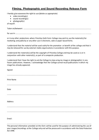 This document gives Priestley Sixth Form College permission to use video recordings, sound recordings, and photographs of an individual. It allows the college to use the materials for marketing, publicity, and other productions in electronic, web, or paper formats. The individual understands the college will solely use the materials to promote the college and may release them to external media organizations for this purpose. The copyright of the materials belongs to Priestley College, who may use or combine them as needed. The individual can request the college stop using their images in future publications, but already published materials cannot be recalled.