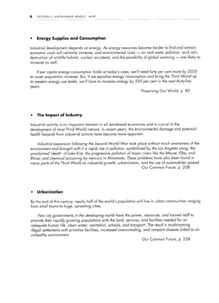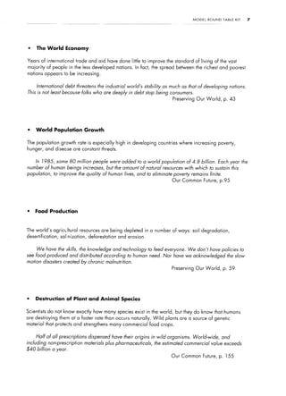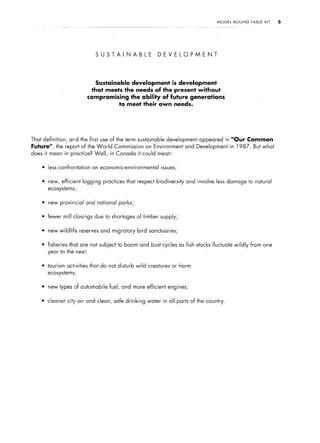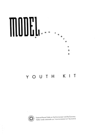 The document provides an education package on sustainable development and round tables aimed at engaging youth. It includes a facilitator's guide to help students simulate round tables to identify stakeholders and reach consensus on issues. The package also features a poster on sustainable development objectives and an interactive computer disc on energy. The goal is to encourage young people to get involved in creating a more sustainable future.