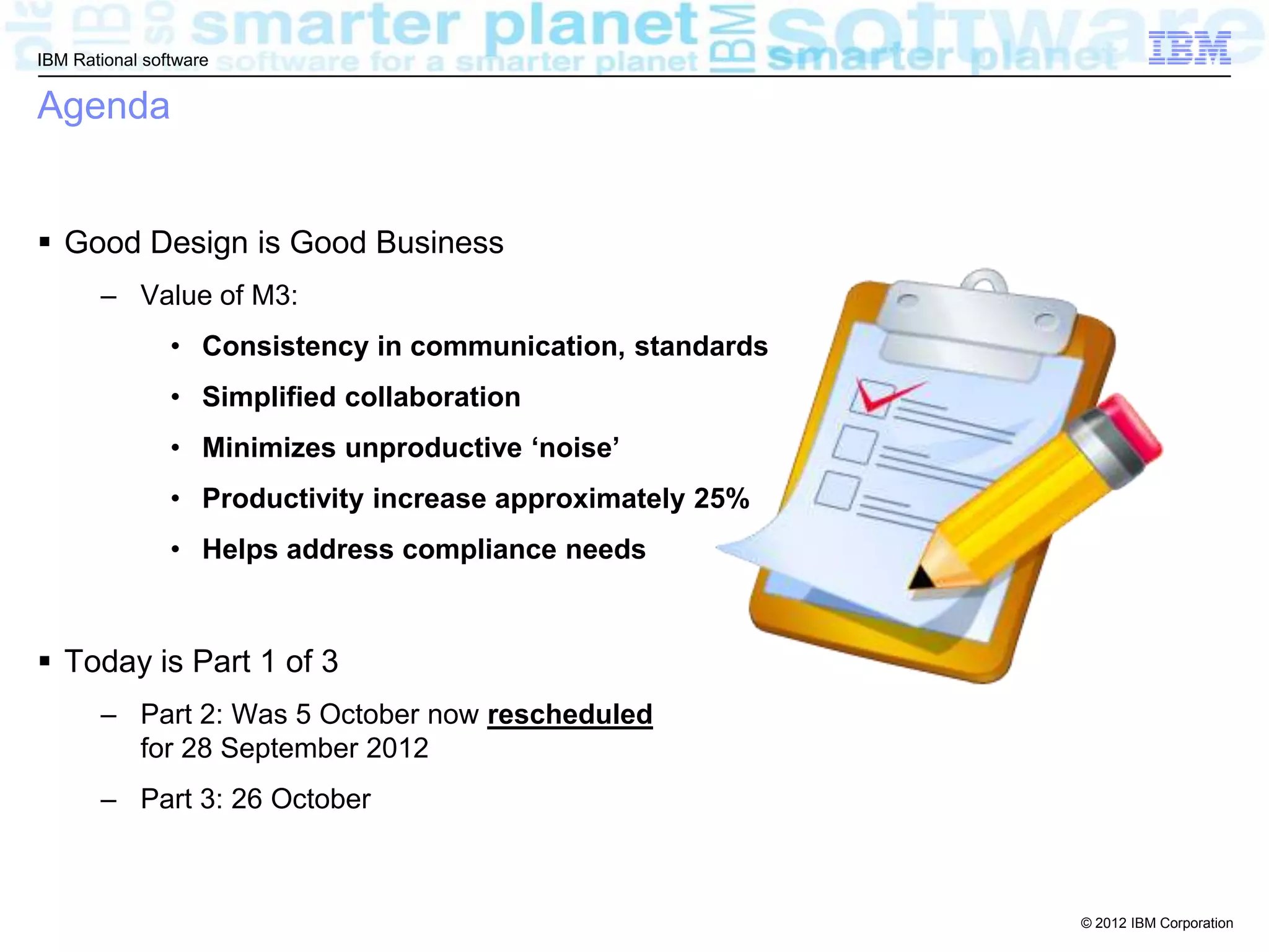 The document outlines a series of sessions on good design practices in software development, focusing on the M3 modeling methodology, which is a disciplined agile framework for system modeling. It emphasizes the importance of effective requirements analysis and standardization in improving productivity and collaboration in software projects. The methodology integrates multiple modeling perspectives and tools, encouraging both top-down and bottom-up approaches to architecture development.