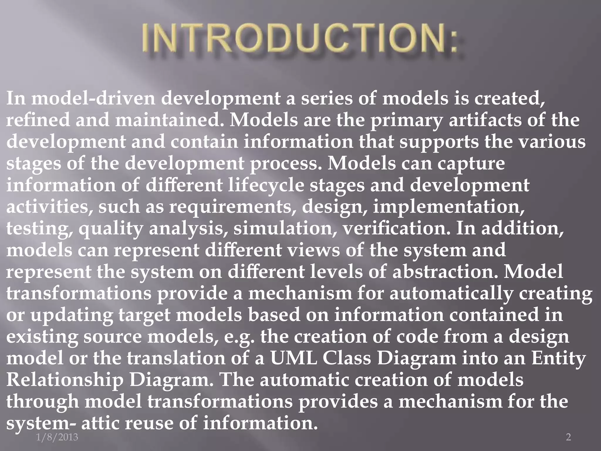 - In model-driven development, models are primary artifacts that capture information at different lifecycle stages and support development activities like requirements, design, implementation, and testing.