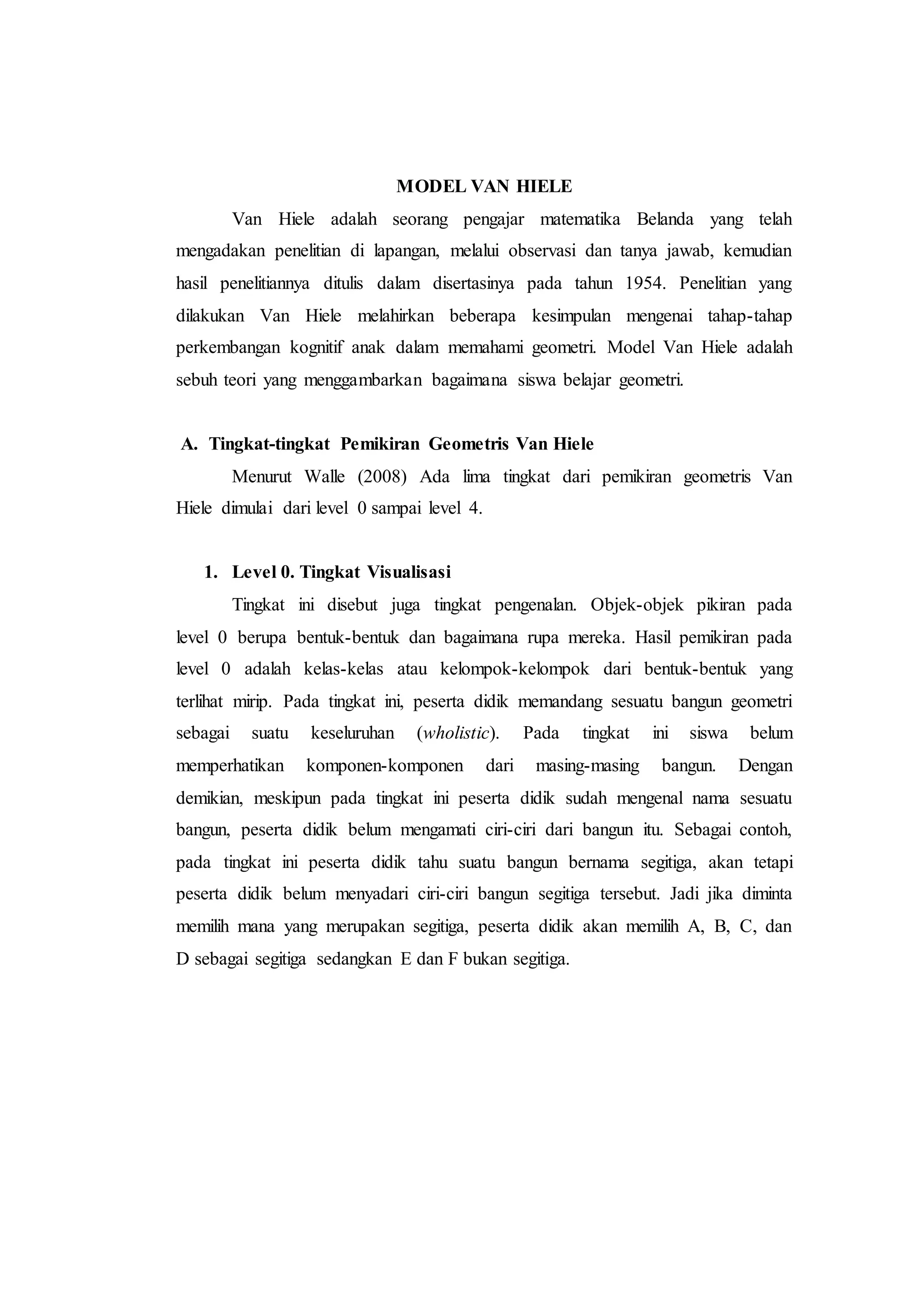 Model Van Hiele menjelaskan lima tingkat perkembangan kognitif siswa dalam memahami geometri, yaitu tingkat visualisasi, analisis, abstraksi, deduksi formal, dan rigor. Setiap tingkat memiliki ciri pemahaman geometri yang berbeda dan berurutan, dimulai dari mengenal bentuk hingga memahami sistem geometri secara formal.