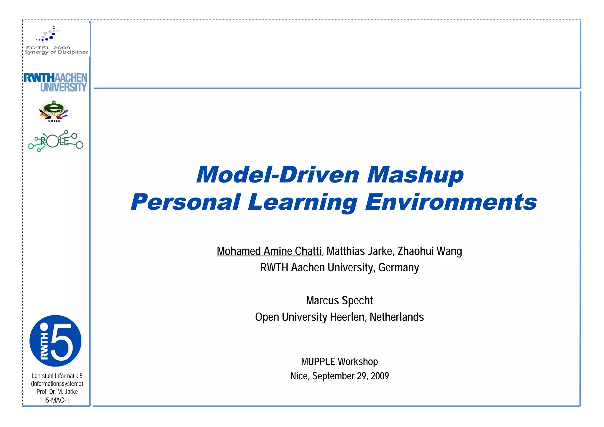 The document discusses model-driven mashups for personal learning environments. It proposes using service mapping descriptions (SMD) to describe RESTful services and automatically generate mashups by combining multiple services. This allows for scalable, client-side mashups across domains via JSONP. SMD provides a lightweight JSON format for annotating services with inputs, outputs, and invocation details to enable automatic data integration and mediation in mashups.