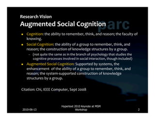 This document summarizes Ed Chi's keynote presentation on augmented social cognition at the Hypertext 2010 workshop. Chi discusses characterizing social systems using analytics, modeling social interactions and dynamics, prototyping tools to increase benefits or reduce costs, and evaluating prototypes with real users. He provides examples of models for information diffusion and Wikipedia growth. Chi also covers challenges in identifying relevant models from literature and techniques for addressing noise in social tagging like synonyms, misspellings and morphologies.