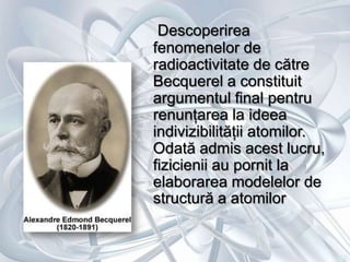 Descoperirea radioactivității de către Becquerel a dus la abandonarea ideii de indivizibilitate a atomilor, permițând dezvoltarea unor modele atomice. Modelul atomic al lui Rutherford a arătat că nucleul atomic este concentrat într-un spațiu mic și încărcat pozitiv, electronii fiind învârtiți în jurul său, pe orbite circulare. Modelul lui Bohr a completat acest concept prin introducerea orbitelor stationare, stabilind că electronii pot emite sau absorbi energie doar prin tranziții între aceste orbite.