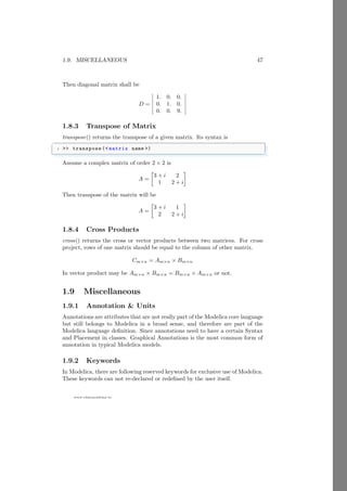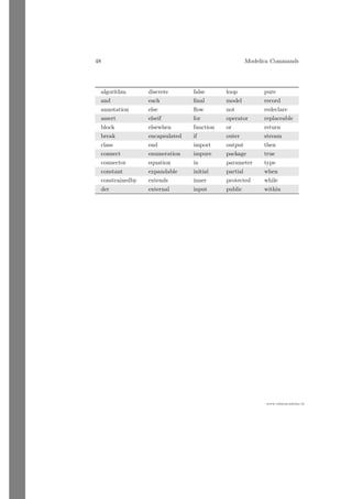 The document serves as an introduction to Modelica, detailing its commands, syntax, and structures such as classes and functions. It covers various topics including variables, equations, events, statements, and mathematical operations, aimed at users familiar with programming in C. The content is structured for implementation within simulators like Xcos and MapleSim while encouraging consultation of the Modelica language specifications for deeper understanding.