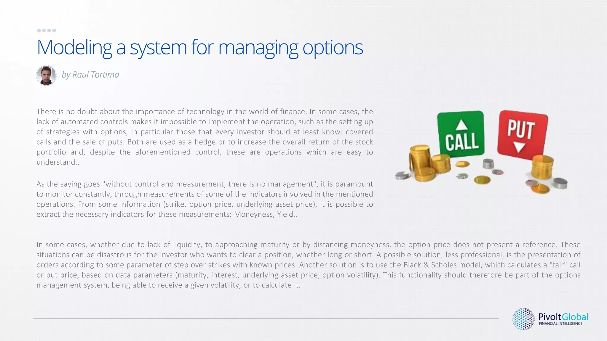 The document discusses modeling a system for managing options trading. It describes including key indicators like moneyness and yield to monitor positions. The system would display opportunities to enter long or short positions ordered by filters like volatility. It also suggests simulating scenarios like exercise, repurchase, and rollover to analyze potential gains and losses over time.