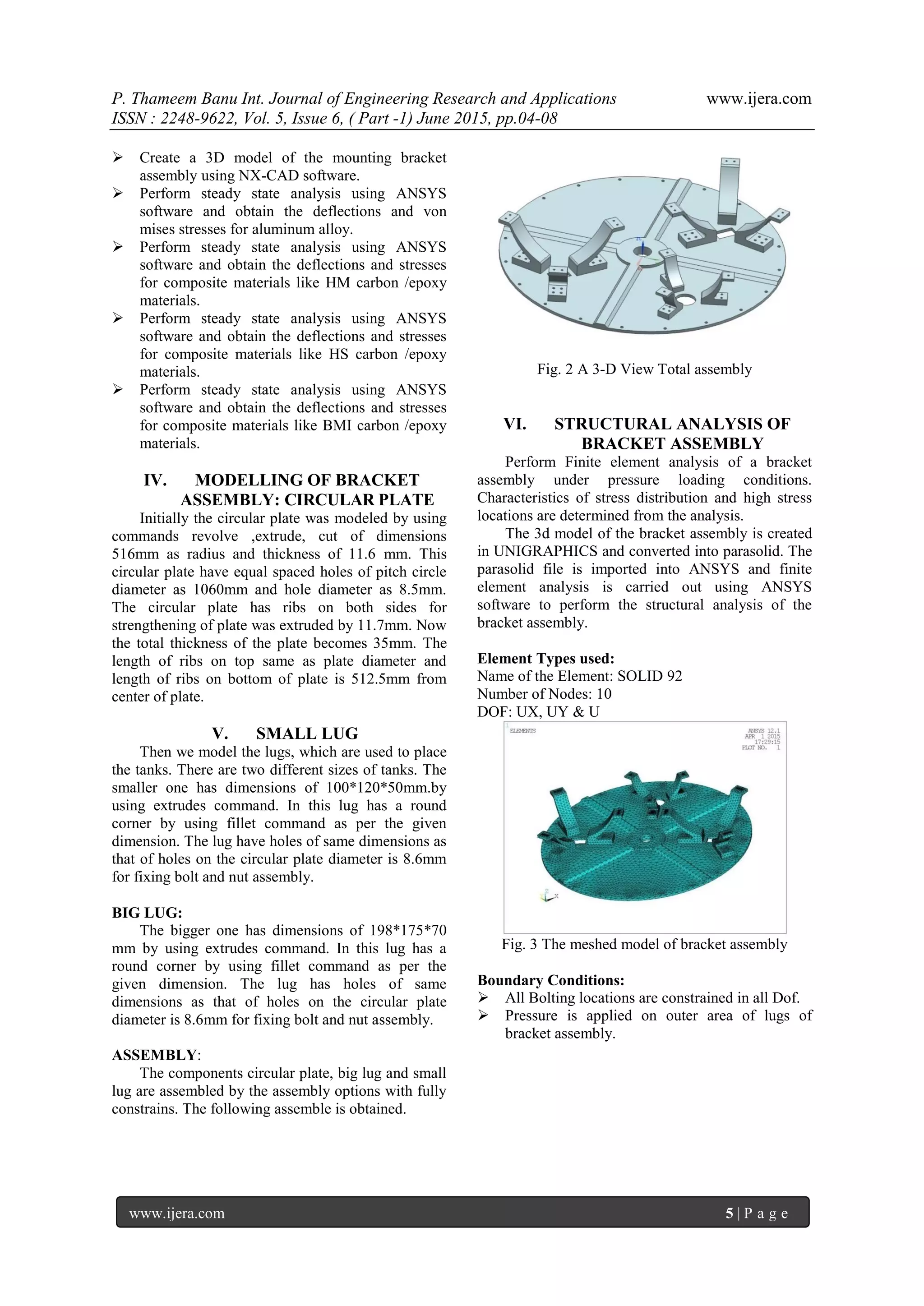 The document presents a study on the modeling and static analysis of a bracket assembly used in the aerospace industry, specifically for carrying fuel and air tanks. The analysis involves the use of NX-CAD for modeling and ANSYS for finite element analysis to determine the stresses and deflections under pressure loads. The findings conclude that the assembly is safe under various loading conditions and that composite materials, particularly hs carbon/epoxy, offer advantages in terms of safety and weight compared to aluminum alloy.