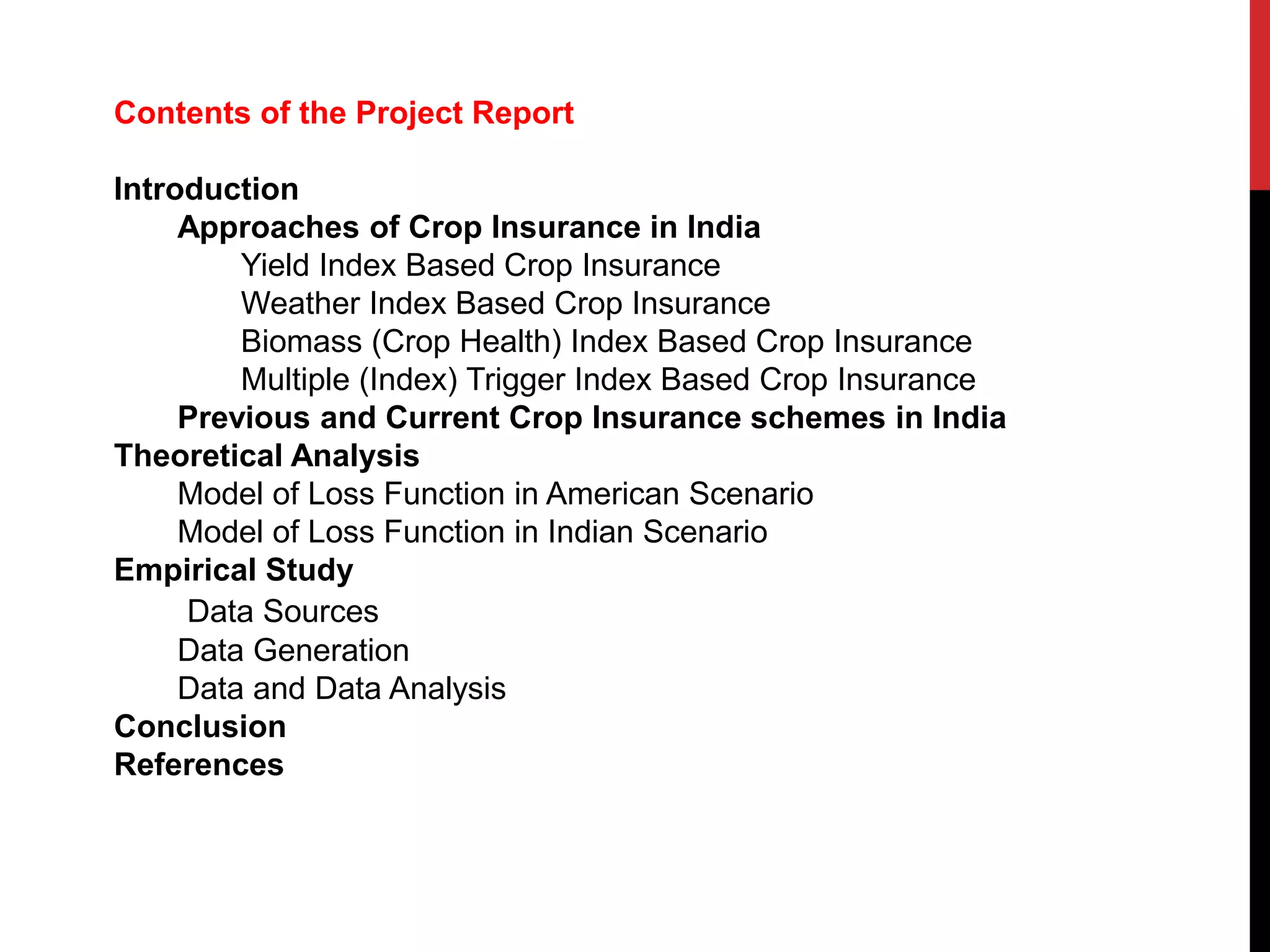This project report examines the modeling and estimation of loss functions for crop insurance in India, addressing the agricultural sector's exposure to systemic and covariant risks. It details various approaches to crop insurance, such as yield index, weather index, and biomass index-based insurance, while providing theoretical analyses of loss functions and empirical studies based on yield data from Hanumangarh district. The report aims to develop a usable loss function to guide individual farmers in their insurance decisions based on production costs, indemnity, and climate conditions.