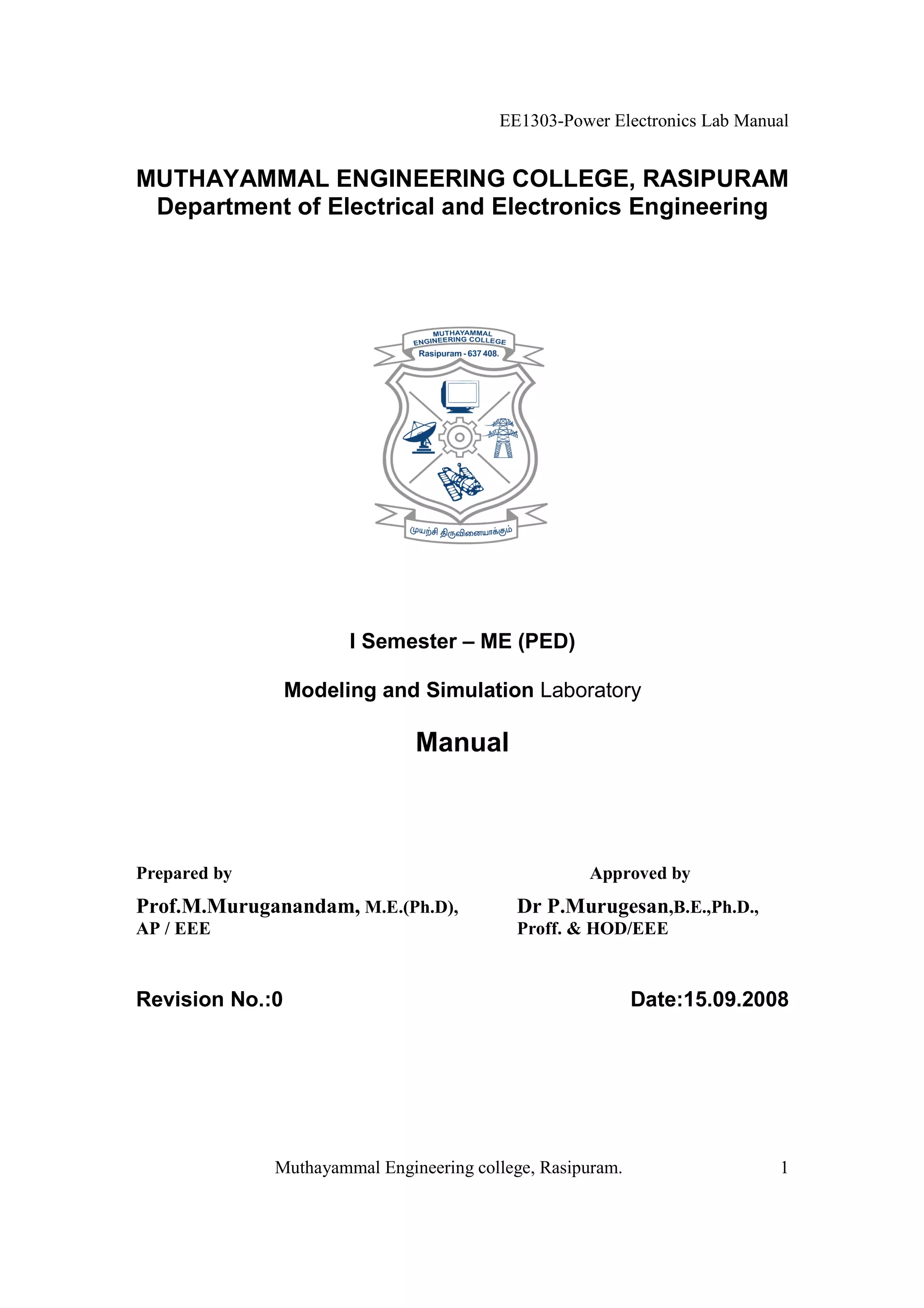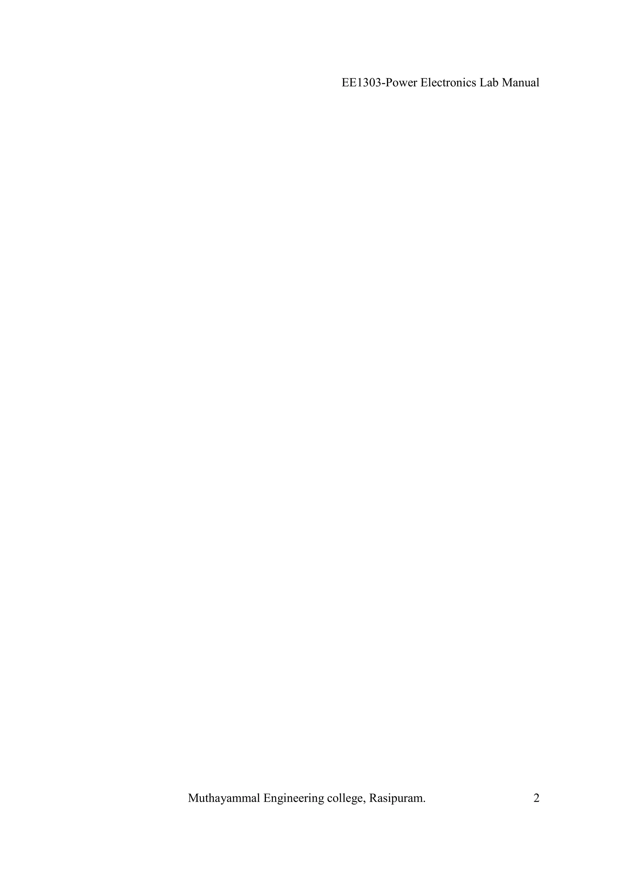 The EE1303 Power Electronics Lab Manual from Muthayammal Engineering College provides detailed instructions for conducting various experiments in power electronics, emphasizing safety protocols, attendance, and record-keeping. It outlines multiple experiments, including the characteristics of different semiconductor devices like SCRs and MOSFETs, and the operations of AC to DC converters, both fully and half-controlled. Each experiment includes aims, required apparatus, procedures, and formulas for analyzing electrical characteristics and performance parameters.