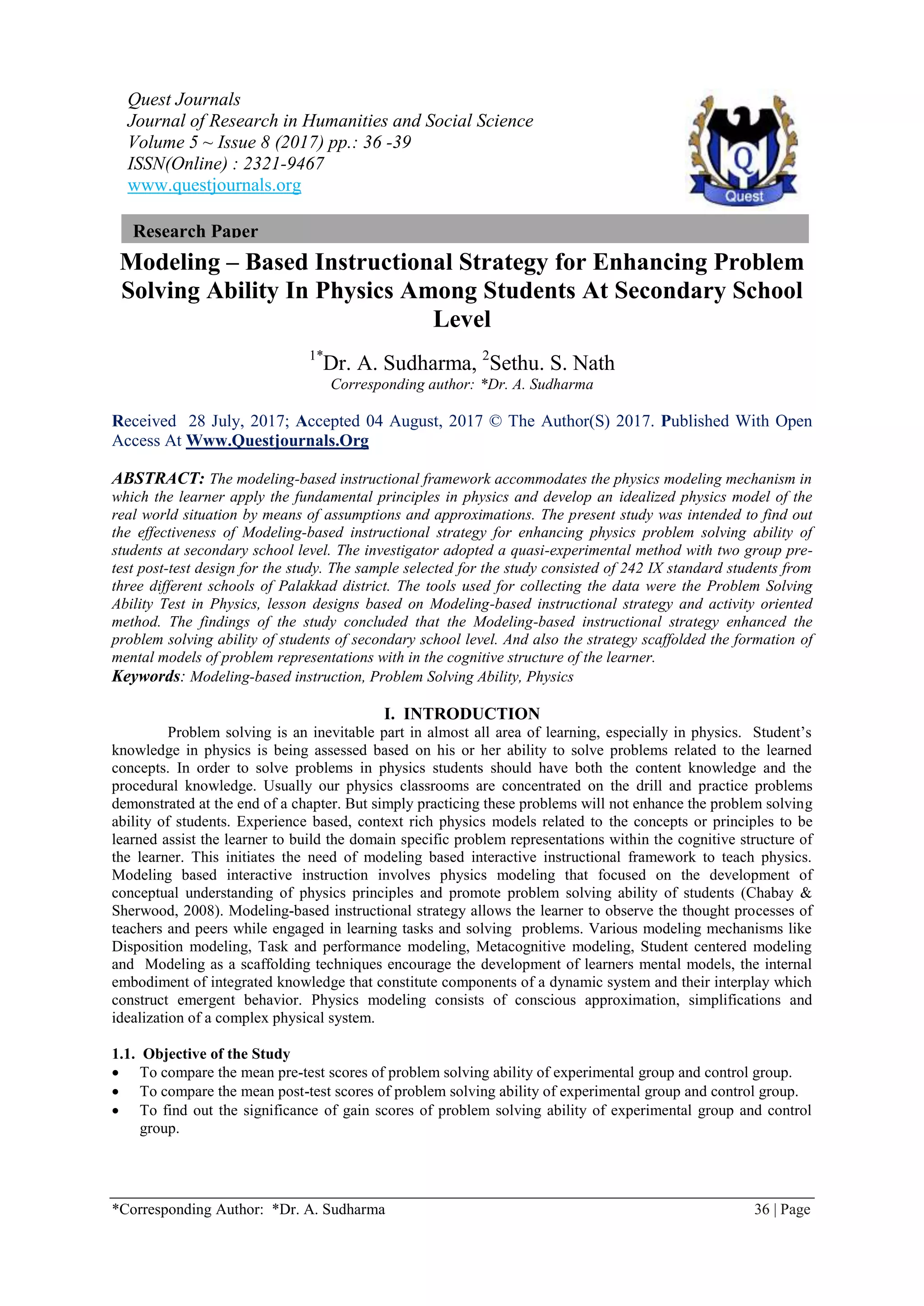 The study evaluates the effectiveness of a modeling-based instructional strategy in enhancing secondary school students' problem-solving abilities in physics. Using a quasi-experimental design involving 242 students, it found that the experimental group demonstrated significantly improved problem-solving skills compared to the control group after intervention. The findings suggest that this instructional strategy facilitates the development of mental models and enhances cognitive understanding of physics principles.
