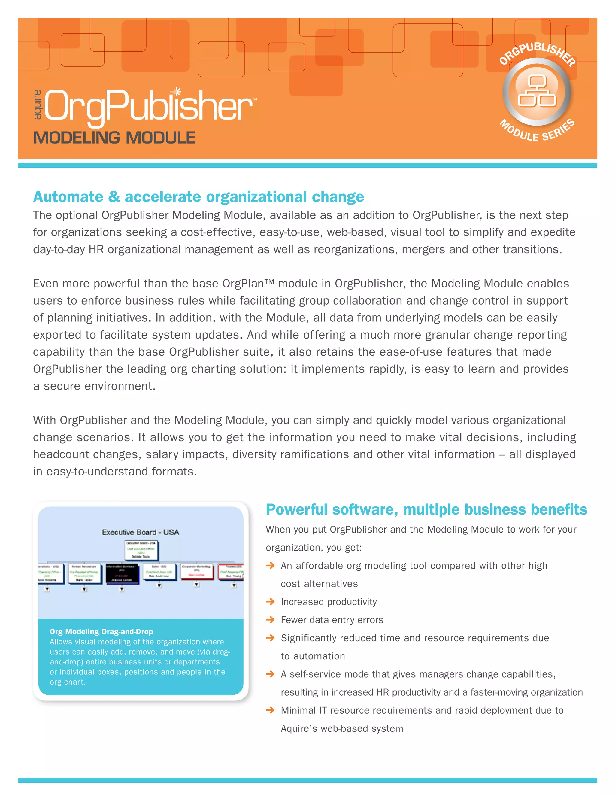 The document discusses OrgPublisher's optional Modeling Module, which allows organizations to model organizational changes through a visual interface and enforce business rules. It enables collaboration and change control during planning initiatives. The module provides granular change reporting and allows data extraction to facilitate system updates. It offers a cost-effective way for organizations to simplify and accelerate change management processes like reorganizations and mergers.