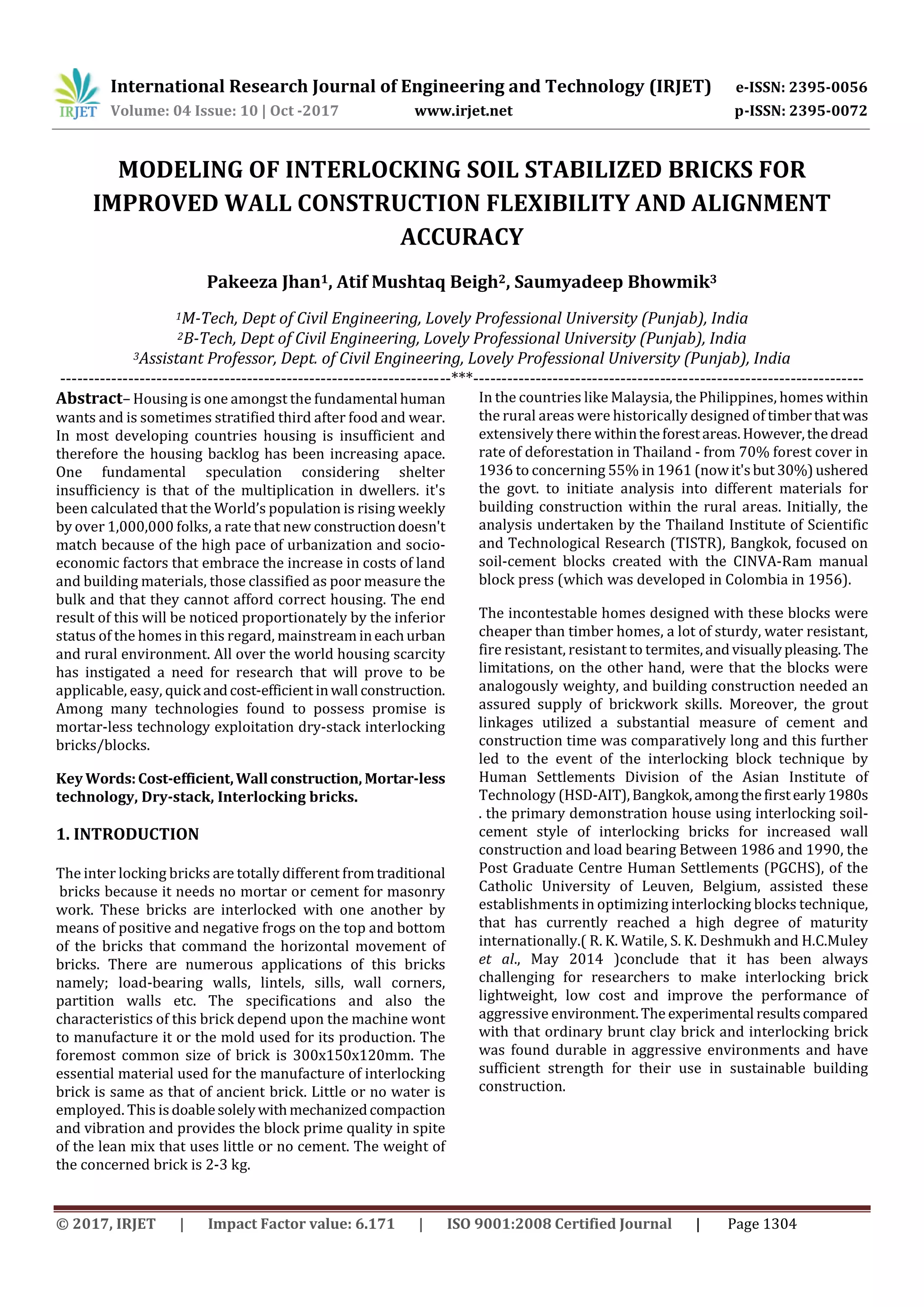 This document summarizes research on modeling interlocking soil-stabilized bricks to improve wall construction flexibility and alignment accuracy. Key points: