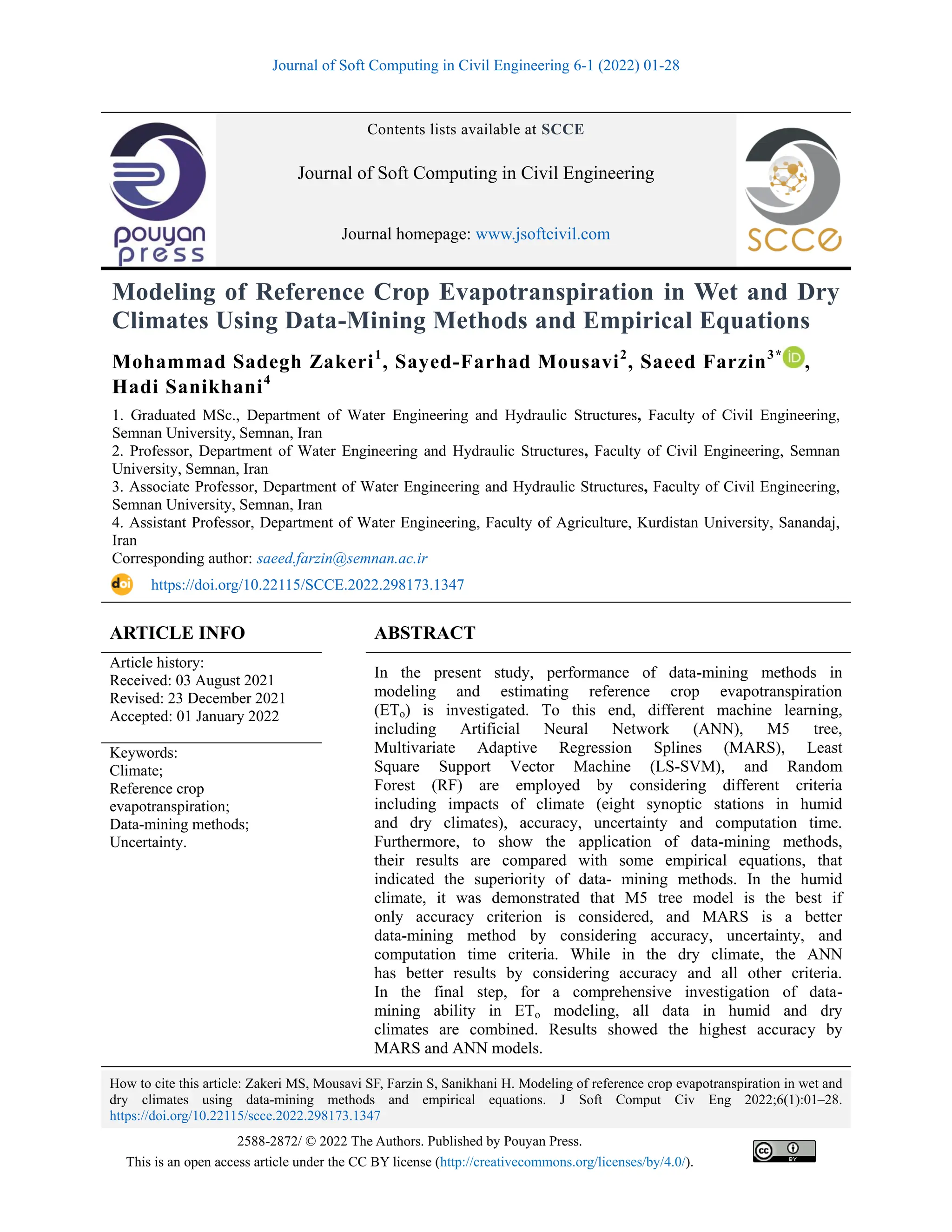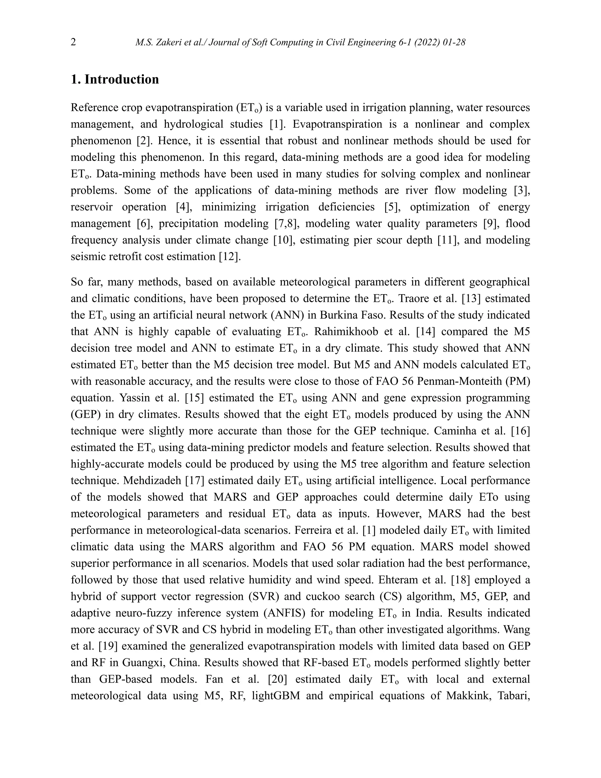 In the present study, performance of data-mining methods in modeling and estimating reference crop evapotranspiration (ETo) is investigated. To this end, different machine learning, including Artificial Neural Network (ANN), M5 tree, Multivariate Adaptive Regression Splines (MARS), Least Square Support Vector Machine (LS-SVM), and Random Forest (RF) are employed by considering different criteria including impacts of climate (eight synoptic stations in humid and dry climates), accuracy, uncertainty and computation time. Furthermore, to show the application of data-mining methods, their results are compared with some empirical equations, that indicated the superiority of data- mining methods. In the humid climate, it was demonstrated that M5 tree model is the best if only accuracy criterion is considered, and MARS is a better data-mining method by considering accuracy, uncertainty, and computation time criteria. While in the dry climate, the ANN has better results by considering accuracy and all other criteria. In the final step, for a comprehensive investigation of data-mining ability in ETo modeling, all data in humid and dry climates are combined. Results showed the highest accuracy by MARS and ANN models.