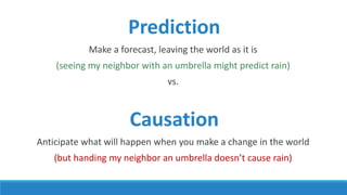 The document discusses causality and experiments in modeling social data. It explains that while prediction involves forecasting based on observation, causation requires determining the effect of making a change. Three types of causal inference are discussed: observational studies which can be biased by confounding factors; randomized experiments which aim to reduce bias through random assignment but have limitations; and natural experiments which exploit real-world occurrences that resemble random experiments. Overall the document emphasizes that determining causal effects rather than just predictive correlations is important but challenging.