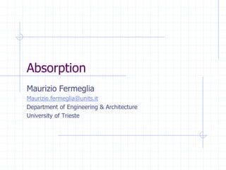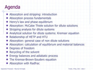 The document presents an overview of absorption and stripping processes in separation operations, highlighting the fundamentals, analytical solutions, and various methodologies such as McCabe-Thiele. Absorption involves the uptake of a gas by a liquid solvent while stripping is the reverse process, and both can operate in equilibrium columns. Key concepts include solubility, energy balances, and the relationships between phases using equations like Henry’s law and the Kremser equation.