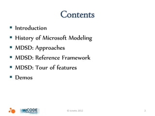 This document provides an overview of model-driven software development (MDSD) focusing on .NET technologies, highlighting the evolution of Microsoft modeling tools and frameworks. It discusses metamodeling, validation, code generation techniques, and model repositories, emphasizing the importance of MDSD in modern software development. The document concludes that MDSD tools have matured and are now essential for precise software engineering.