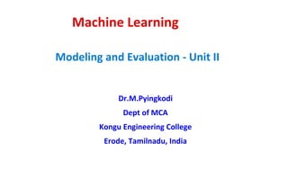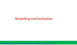 The document discusses machine learning concepts including modeling, evaluation, model selection, training models, and addressing issues like overfitting and underfitting. It explains that modeling tries to emulate human learning through mathematical and statistical formulations. Evaluation methods like holdout, k-fold cross-validation, and leave-one-out cross-validation are used to select models and train them on datasets while avoiding overfitting or underfitting issues. Parametric models have fixed parameters while non-parametric models are based on training data.