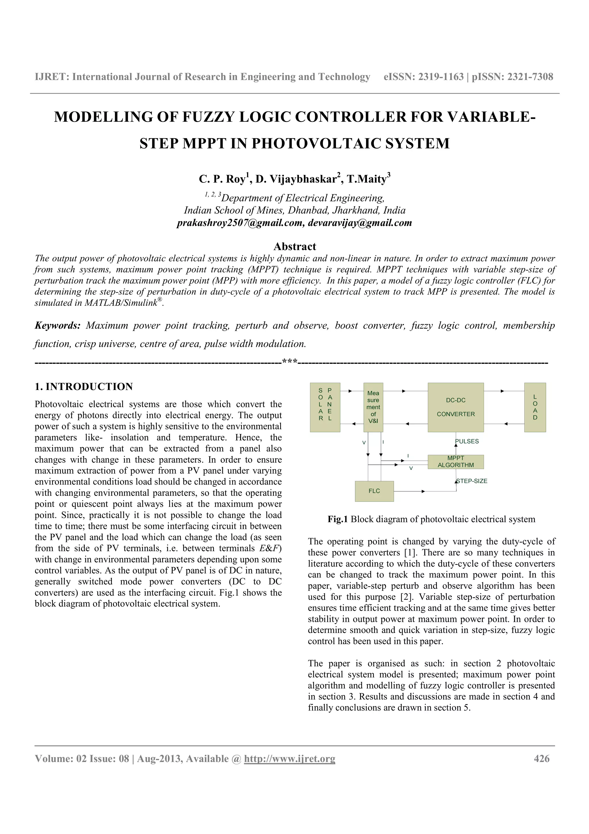 This document describes a fuzzy logic controller (FLC) model for determining the step size of perturbation in the duty cycle of a photovoltaic system to track the maximum power point (MPP). The FLC uses the slope of the power-voltage curve and the perturbation from the previous step as inputs to determine the step size. The FLC model is simulated in MATLAB/Simulink. Simulation results show that the variable step size MPPT technique using FLC extracts maximum power more efficiently under changing environmental conditions compared to fixed step size techniques.