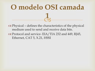 1) Physical layer - Defines physical medium for sending and receiving data bits.