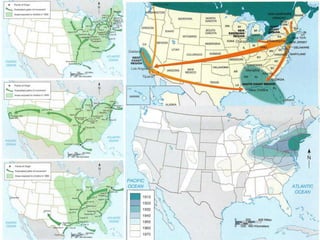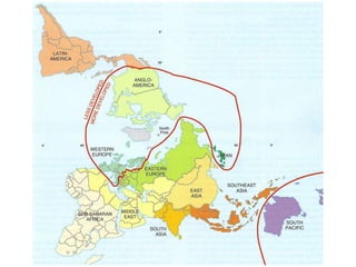 Cultural diffusion is the spread of ideas between cultures through movement of people, goods, or ideas. There are two main types: expansion diffusion which strengthens in the origin, and relocation diffusion which physically moves an idea. Population growth is influenced by birth and death rates and stages of demographic transition. Rostow's model outlines five stages of economic growth through industrialization. Von Thünen analyzed how distance from markets influences land use patterns. Core-periphery and dependency theories address global economic disparities.