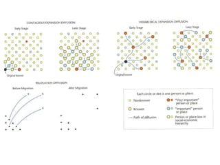 Cultural diffusion is the spread of ideas between cultures through movement of people, goods, or ideas. There are different types of diffusion including expansion, contagious, hierarchical, and relocation diffusion. Population growth is influenced by birth and death rates and follows a demographic transition from high birth/death rates to low birth/death rates as development increases. Rostow's model of development proposes countries progress through five stages from traditional to modernized societies, while dependency theory argues poorer countries remain limited by relationships with wealthier countries.