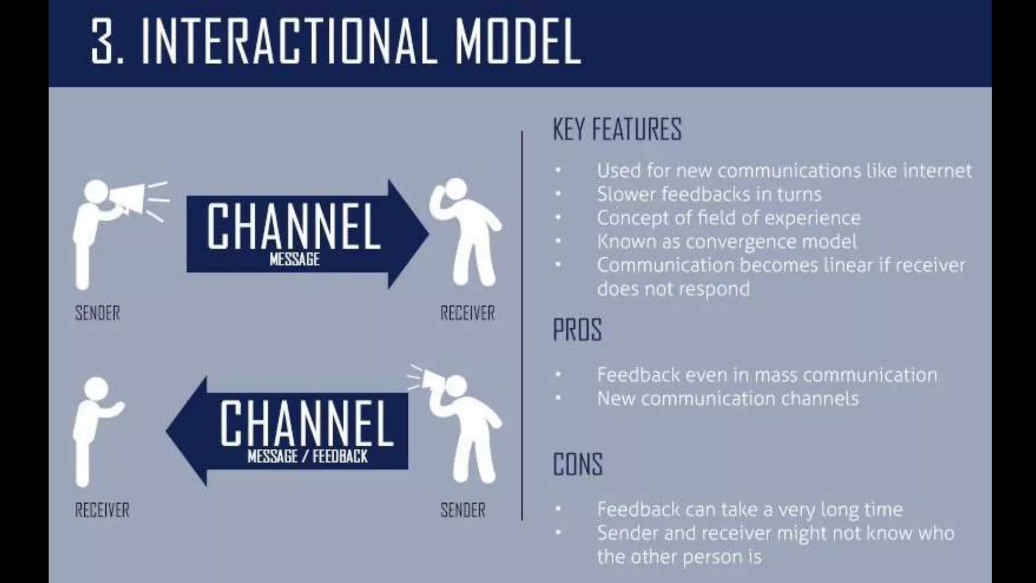 - Interactive models such as Schramm's model and Dance's helical model view communication as a circular process between two or more parties. Each model type is described along with their components and criticisms.